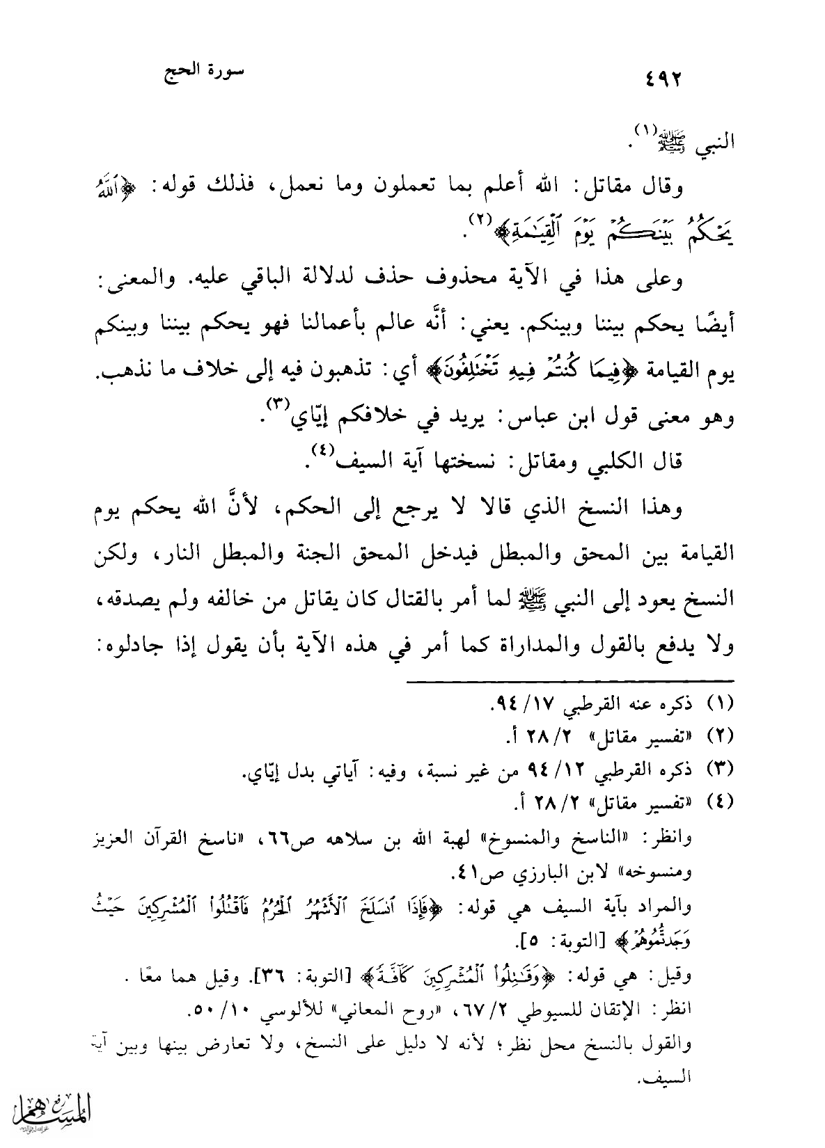 وهذا النسخ الذي قالا لا يرجع إلى الحكم، لأنَّ الله يحكم يوم القيامة بين المحق والمبطل فيدخل المحق الجنة والمبطل النار، ولكن النسخ يعود إلى النبي -صلى الله عليه وسلم- لما أمر بالقتال كان يقاتل من خالفه ولم يصدقه، ولا يدفع بالقول والمداراة كما أمر في هذه الآية بأن يقول إذا جادلوه: