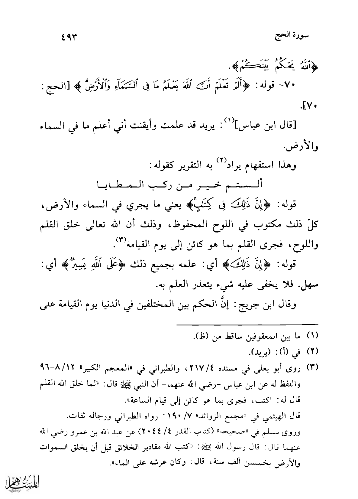 (¬3) روى أبو يعلى في مسنده 4/ 217، والطبراني في "المعجم الكبير" 12/ 8 - 96 واللفظ له عن ابن عباس -رضي الله عنهما- أن النبي -صلى الله عليه وسلم- قال: "لما خلق الله القلم قال له: اكتب، فجرى بما هو كائن إلى قيام الساعة".