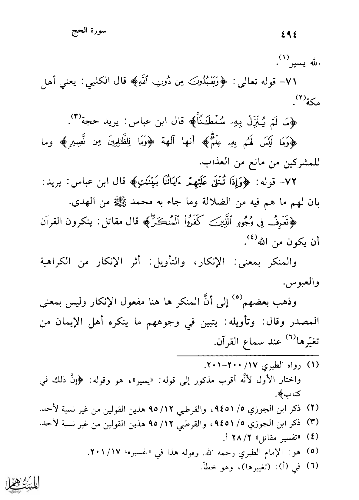 {تَعْرِفُ فِي وُجُوهِ الَّذِينَ كَفَرُوا الْمُنْكَرَ} قال مقاتل: ينكرون القرآن أن يكون من الله (¬4).