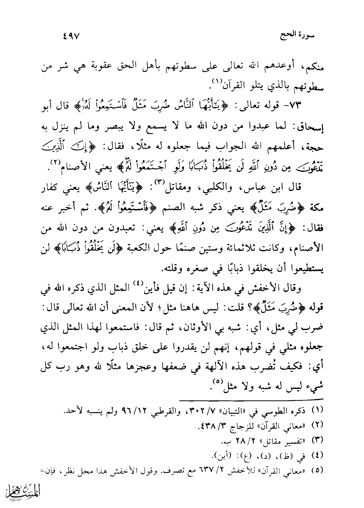 73 - قوله تعالى: {يَا أَيُّهَا النَّاسُ ضُرِبَ مَثَلٌ فَاسْتَمِعُوا لَهُ} قال أبو إسحاق: لما عبدوا من دون الله ما لا يسمع ولا يبصر وما لم ينزل به حجة، أعلمهم الله الجواب فيما جعلوه له مثلاً، فقال: {إِنَّ الَّذِينَ تَدْعُونَ مِنْ دُونِ اللَّهِ لَنْ يَخْلُقُوا ذُبَابًا وَلَوِ اجْتَمَعُوا لَهُ} يعني الأصنام (¬2).