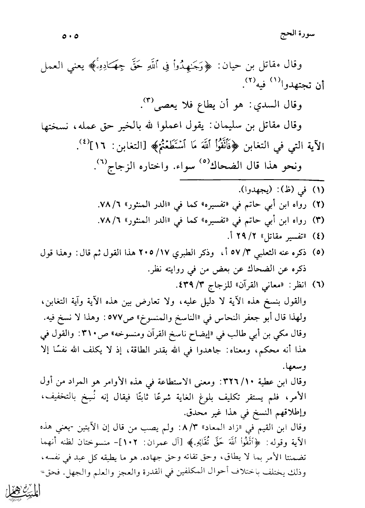 والقول بنسخ هذه الآية لا دليل عليه، ولا تعارض بين هذه الآية وآية التغابن، ولهذا قال أبو عثمان النحاس في "الناسخ والمنسوخ" ص 577: وهذا لا نسخ فيه. وقال مكي بن أبي طالب في "إيضاح ناسخ القرآن ومنسوخه" ص 310: والقول في هذا أنه محكم، ومعناه: جاهدوا في الله بقدر الطاقة، إذ لا يكلف الله نفسًا إلا وسعها.