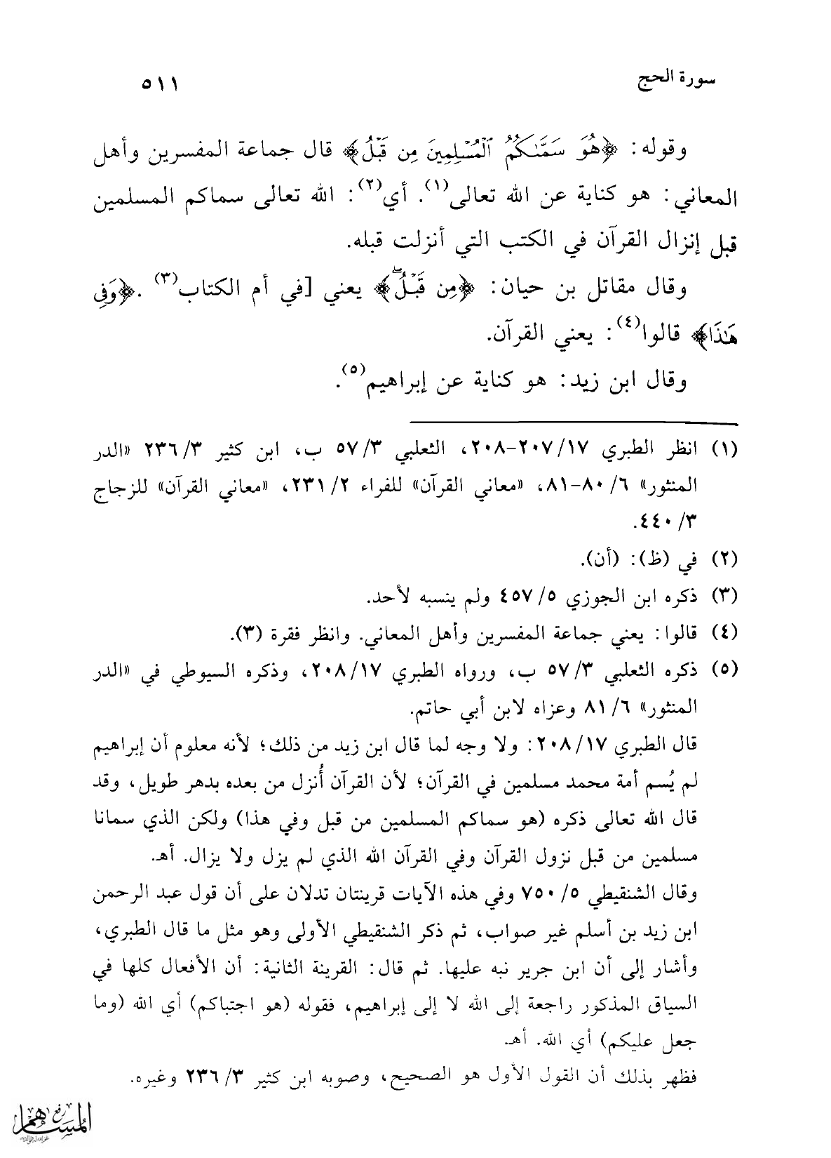 قال الطبري 17/ 208: ولا وجه لما قال ابن زيد من ذلك؛ لأنه معلوم أن إبراهيم لم يُسم أمة محمد مسلمين في القرآن؛ لأن القرآن أُنزل من بعده بدهر طويل، وقد قال الله تعالى ذكره {هُوَ سَمَّاكُمُ الْمُسْلِمِينَ مِنْ قَبْلُ وَفِي هَذَا} ولكن الذي سمانا مسلمين من قبل نزول القرآن وفي القرآن الله الذي لم يزل ولا يزال. أهـ.