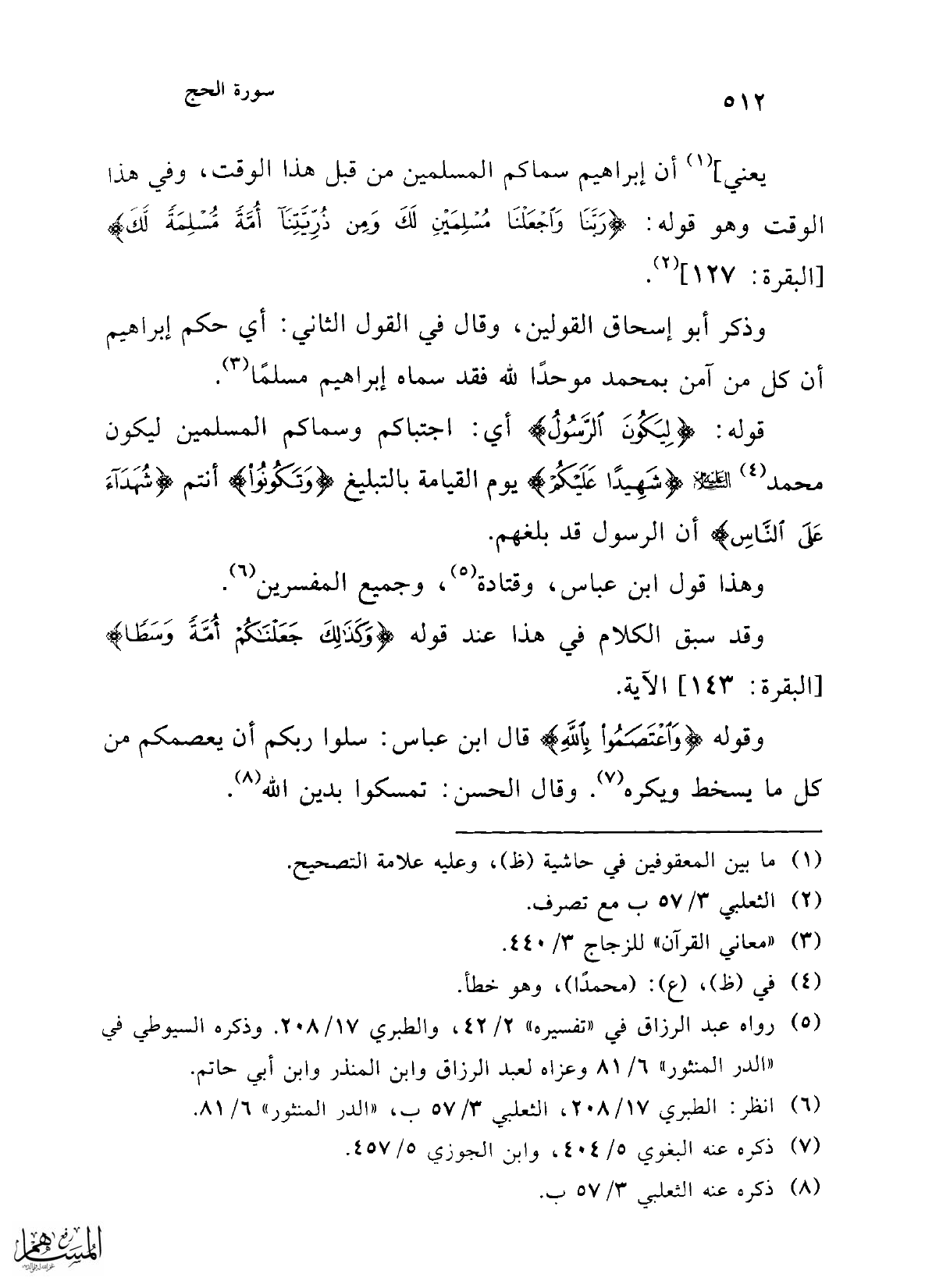 قوله: {لِيَكُونَ الرَّسُولُ} أي: اجتباكم وسماكم المسلمين ليكون محمد (¬4) عليه السلام {شَهِيدًا عَلَيْكُمْ} يوم القيامة بالتبليغ {وَتَكُونُوا} أنتم {شُهَدَاءَ عَلَى النَّاسِ} أن الرسول قد بلغهم.