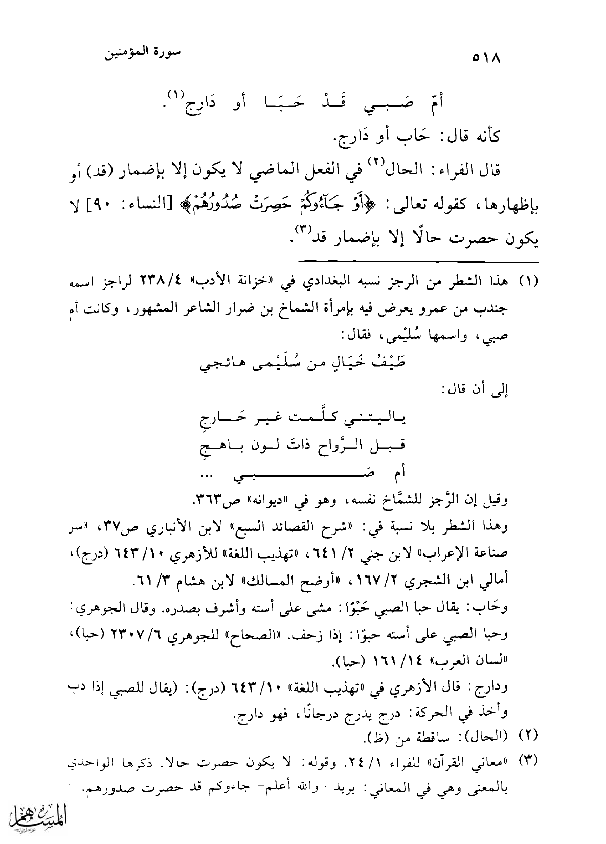 وهذا الشطر بلا نسبة في: "شرح القصائد السبع" لابن الأنباري ص 37، "سر صناعة الإعراب" لابن جني 2/ 641، "تهذيب اللغة" للأزهري 10/ 643 (درج)، أمالي ابن الشجري 2/ 167، "أوضح المسالك" لابن هشام 3/ 61.