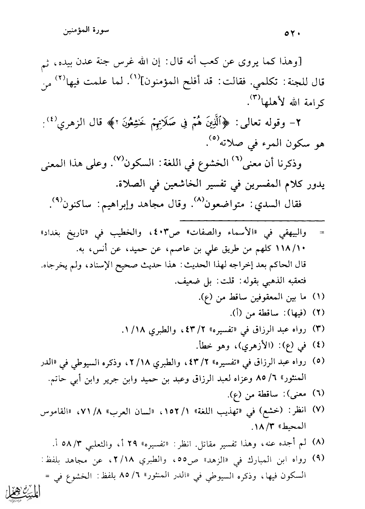 2 - وقوله تعالى: {الَّذِينَ هُمْ فِي صَلَاتِهِمْ خَاشِعُونَ} قال الزهري (¬4): هو سكون المرء في صلاته (¬5).