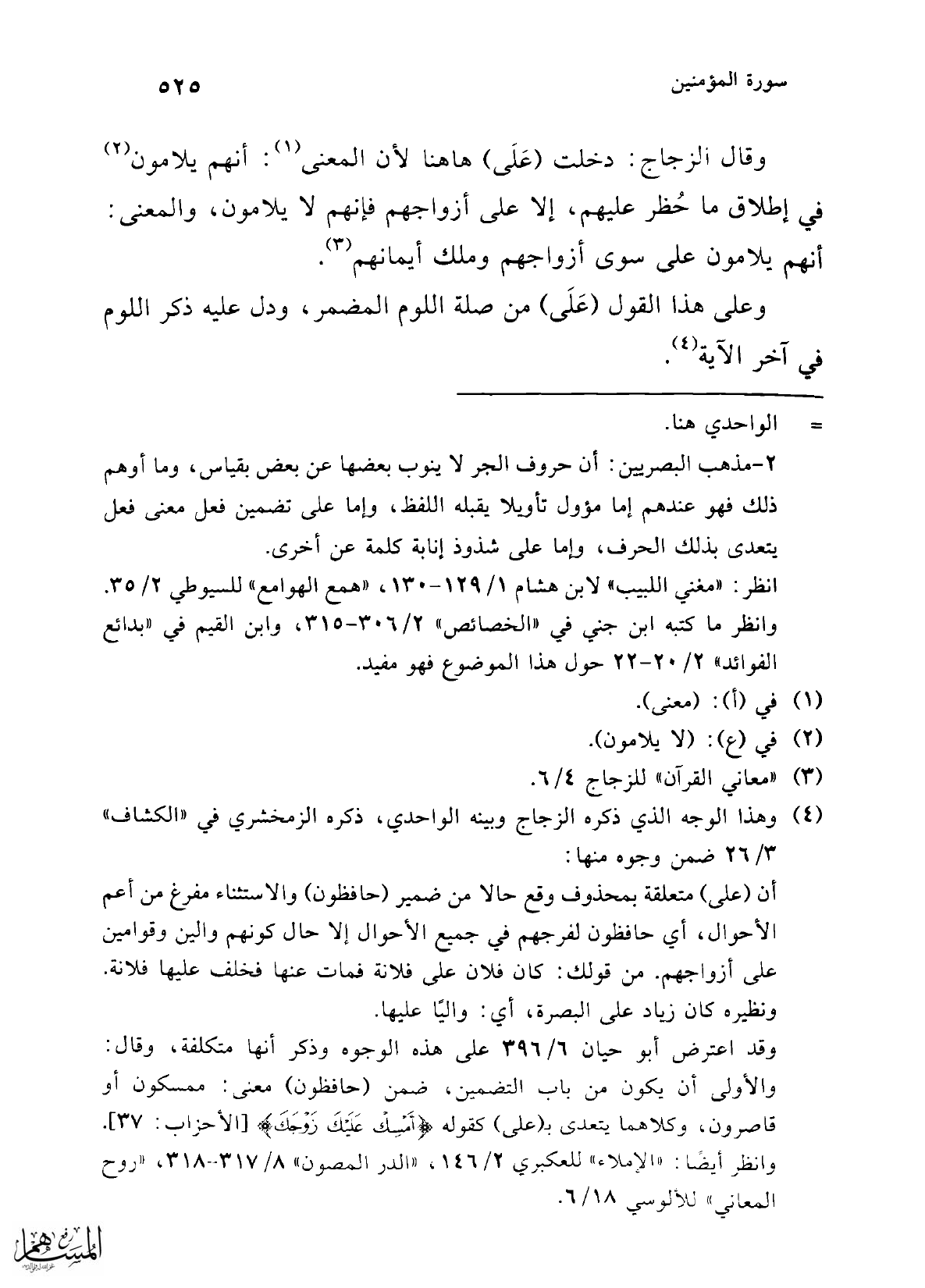 وقد اعترض أبو حيان 6/ 396 على هذه الوجوه وذكر أنها متكلفة، وقال: والأولى أن يكون من باب التضمين، ضمن (حافظون) معنى: ممسكون أو قاصرون، وكلاهما يتعدى بـ (على) كقوله {أَمْسِكْ عَلَيْكَ زَوْجَكَ} [الأحزاب: 37]. وانظر أيضًا: "الإملاء" للعكبري 2/ 146، "الدر المصون" 8/ 317 - 318، "روح المعاني" للألوسي 18/ 6.