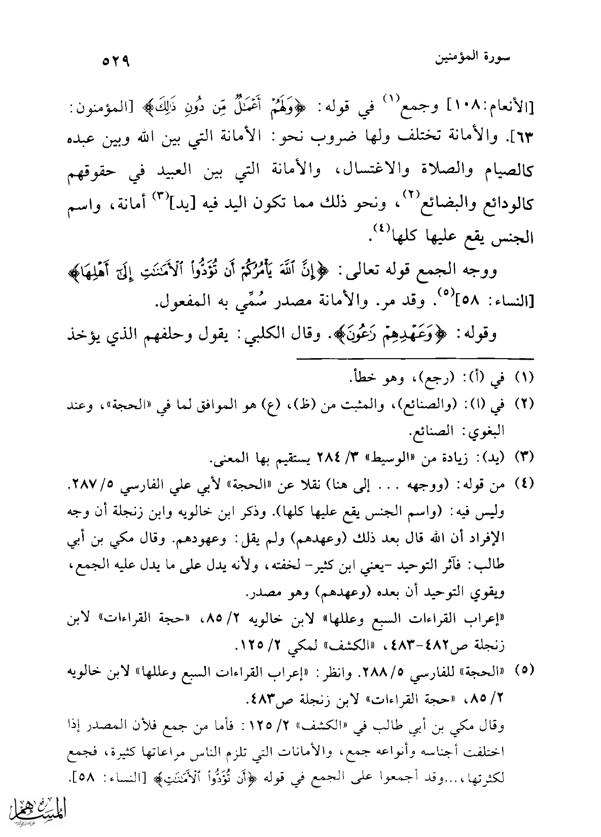 (¬4) من قوله: (ووجهه ... إلى هنا) نقلا عن "الحجة" لأبي علي الفارسي 5/ 287. وليس فيه: (واسم الجنس يقع عليها كلها). وذكر ابن خالويه وابن زنجلة أن وجه الإفراد أن الله قال بعد ذلك (وعهدهم) ولم يقل: وعهودهم. وقال مكي بن أبي طالب: فآثر التوحيد -يعني ابن كثير- لخفته، ولأنه يدل على ما يدل عليه الجمع، ويقوي التوحيد أن بعده (وعهدهم) وهو مصدر.