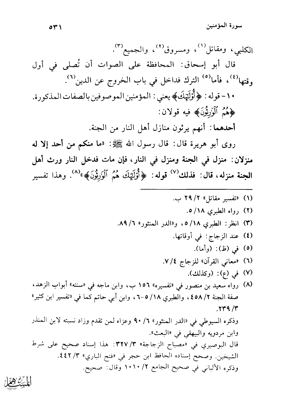 روى أبو هريرة قال: قال رسول الله -صلى الله عليه وسلم-: "ما منكم من أحد إلا له منزلان: منزل في الجنة ومنزل في النار، فإن مات فدخل النار ورث أهل الجنة منزله، قال: فدلك (¬7) قوله: {أُولَئِكَ هُمُ الْوَارِثُونَ} " (¬8). وهذا تفسير
