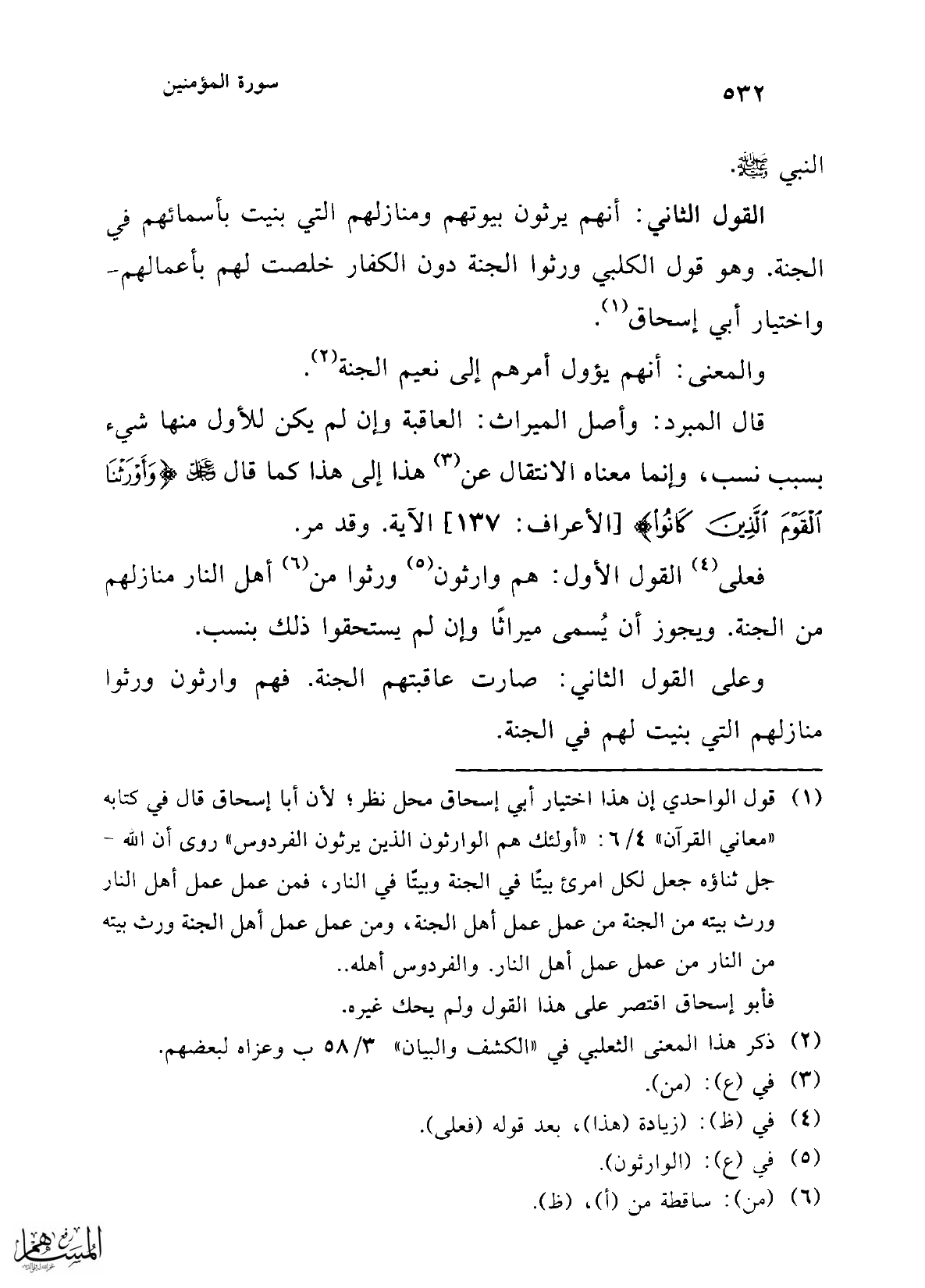 (¬1) قول الواحدي إن هذا اختيار أبي إسحاق محل نظر؛ لأن أبا إسحاق قال في كتابه "معاني القرآن" 4/ 6: "أولئك هم الوارثون الذين يرثون الفردوس" روى أن الله - جل ثناؤه جعل لكل امرئ بيتًا في الجنة وبيتًا في النار، فمن عمل عمل أهل النار ورث بيته من الجنة من عمل عمل أهل الجنة، ومن عمل عمل أهل الجنة ورث بيته من النار من عمل عمل أهل النار. والفردوس أهله ..