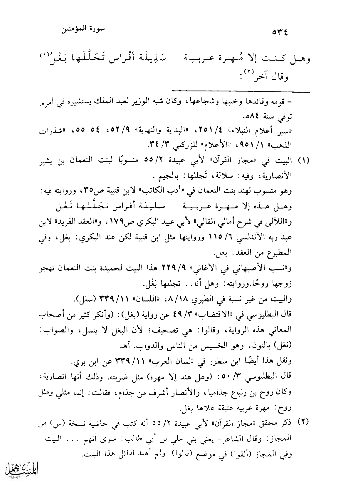 و"نسب الأصبهاني في الأغاني" 9/ 229 هذا البيت لحميدة بنت النعمان تهجو زوجها روحًا. وروايته: وهل أنا .. تجللها بَغْل.