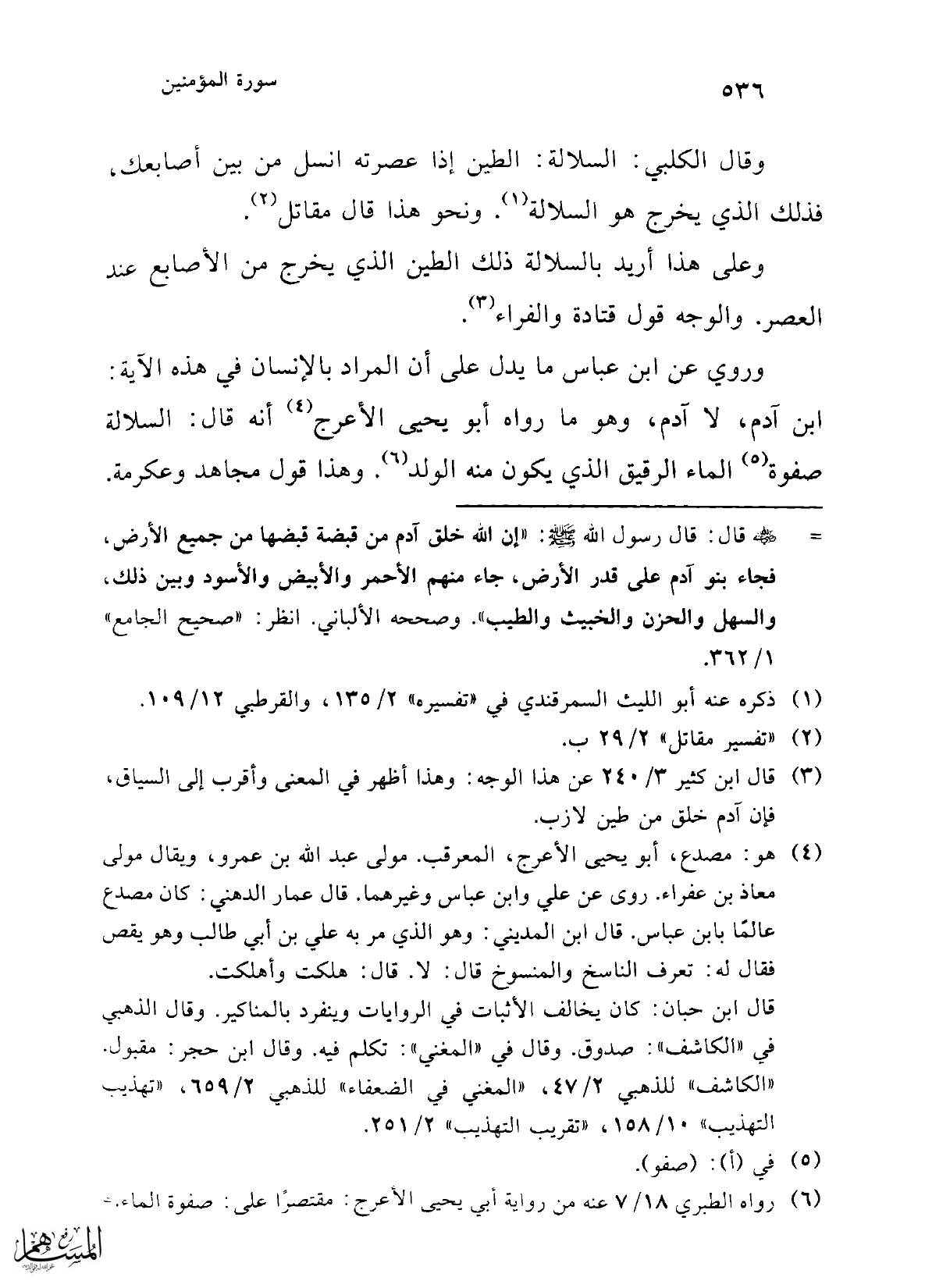 وروي عن ابن عباس ما يدل على أن المراد بالإنسان في هذه الآية: ابن آدم، لا آدم، وهو ما رواه أبو يحيى الأعرج (¬4) أنه قال: السلالة صفوة (¬5) الماء الرقيق الذي يكون منه الولد (¬6). وهذا قول مجاهد وعكرمة.