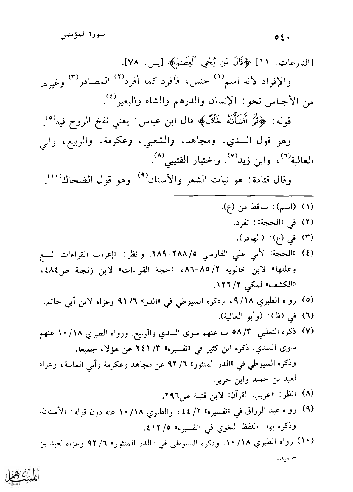 (¬4) "الحجة" لأبي علي الفارسي 5/ 288 - 289. وانظر: "إعراب القراءات السبع وعللها" لابن خالويه 2/ 85 - 86، "حجة القراءات" لابن زنجلة ص 484، "الكشف" لمكي 2/ 126.