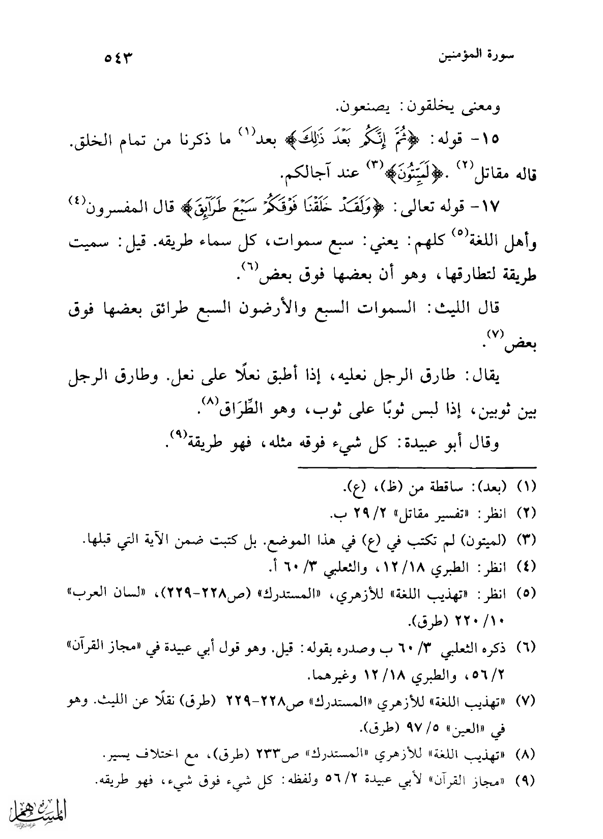 (¬5) انظر: "تهذيب اللغة" للأزهري، "المستدرك" (ص 228 - 229)، "لسان العرب" 10/ 220 (طرق).