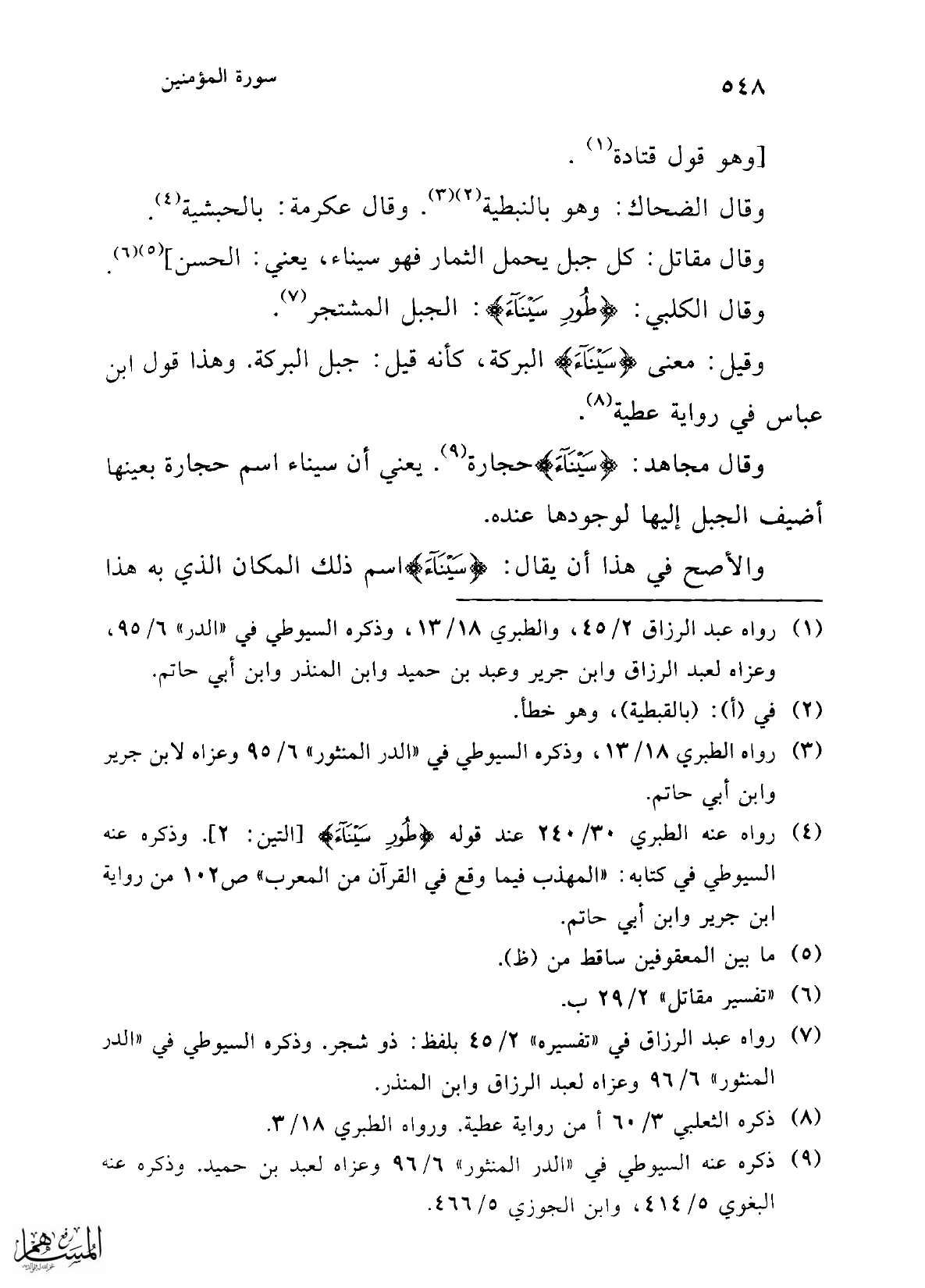 (¬4) رواه عنه الطبري 30/ 240 عند قوله {طُورِ سَيْنَاءَ} [التين: 2]. وذكره عنه السيوطي في كتابه: "المهذب فيما وقع في القرآن من المعرب" ص 102 من رواية ابن جرير وابن أبي حاتم.