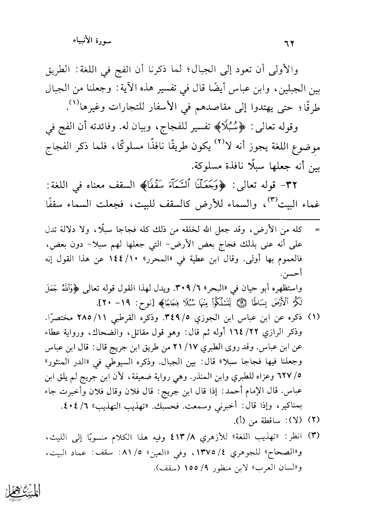وقوله تعالى: {سُبُلًا} تفسير للفجاج، وبيان له. وفائدته أن الفج في موضوع اللغة يجوز أنه لا (¬2) يكون طريقاً نافذاً مسلوكاً، فلما ذكر الفجاج بين أنه جعلها سبلاً نافذة مسلوكة.