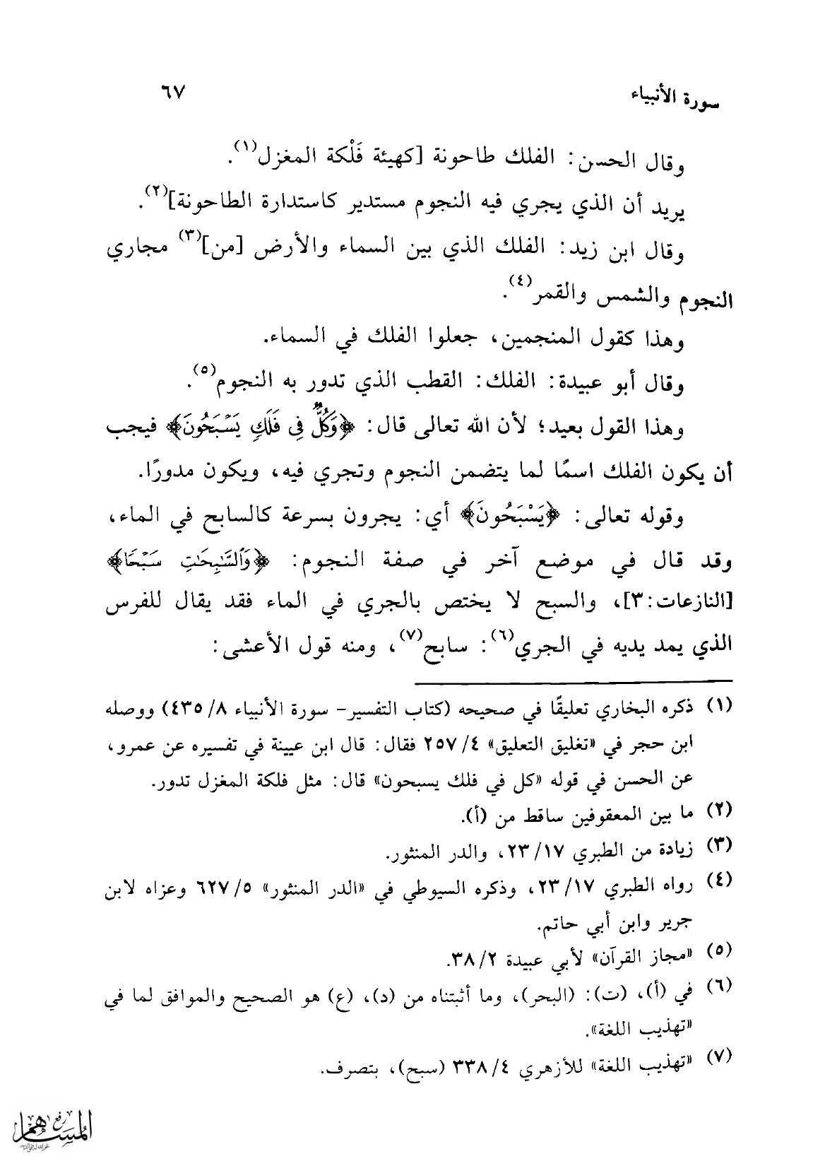 (¬1) ذكره البخاري تعليقًا في صحيحه (كتاب التفسير- سورة الأنبياء 8/ 435) ووصله ابن حجر في "تغليق التعليق" 4/ 257 فقال: قال ابن عيينة في تفسيره عن عمرو، عن الحسن في قوله "كل في فلك يسبحون" قال: مثل فلكة المغزل تدور.