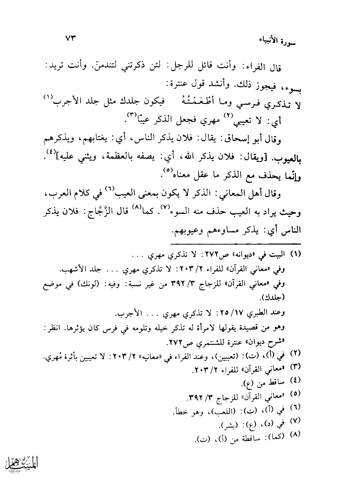 وقال أهل المعاني: الذكر لا يكون بمعنى العيب (¬6) في كلام العرب، وحيث يراد به العيب حذف منه السوء (¬7). كما (¬8) قال الزَّجَّاج؛ فلان يذكر الناس أي: يذكر مساوءهم وعيوبهم.