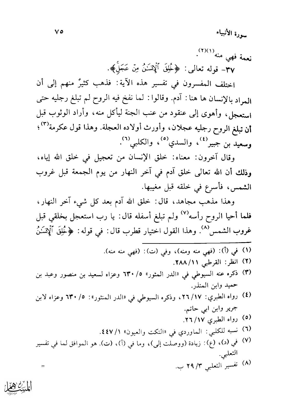 اختلف المفسرون في تفسير هذه الآية: فذهب كثيرٌ منهم إلى أن المراد بالإنسان هاهنا: آدم. وقالوا: لما نفخ فيه الروح لم تبلغ رجليه حتى استعجل، وأهوى إلى عنقود من عنب الجنة ليأكل منه، وأراد الوثوب قبل أن تبلغ الروح رجليه عجلان، وأورث أولاده العجلة. وهذا قول عكرمة (¬3)، وسعيد بن جبير (¬4)، والسدي (¬5)، والكلبي (¬6).