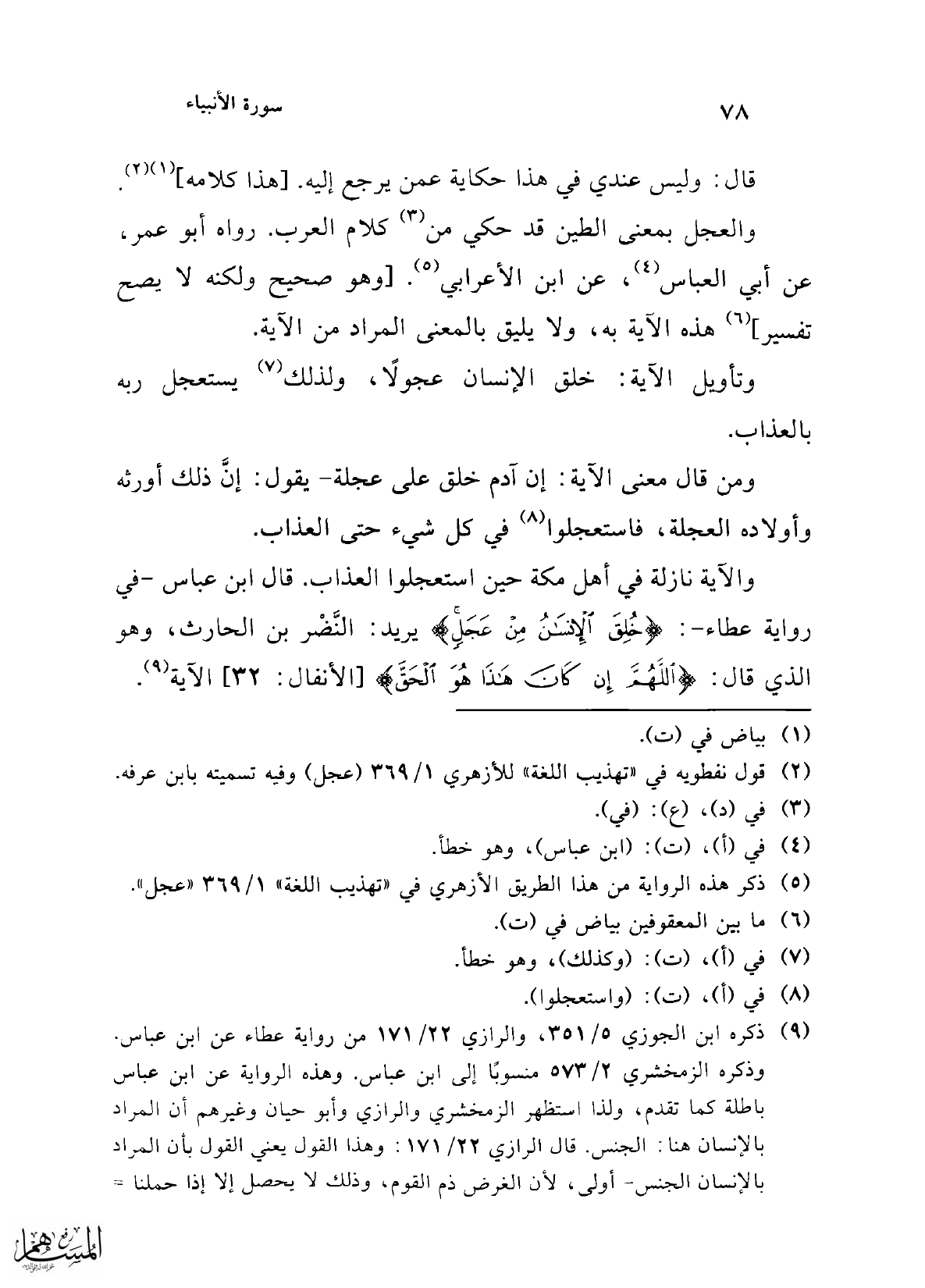 (¬2) قول نفطويه في "تهذيب اللغة" للأزهري 1/ 369 (عجل) وفيه تسميته بابن عرفه.