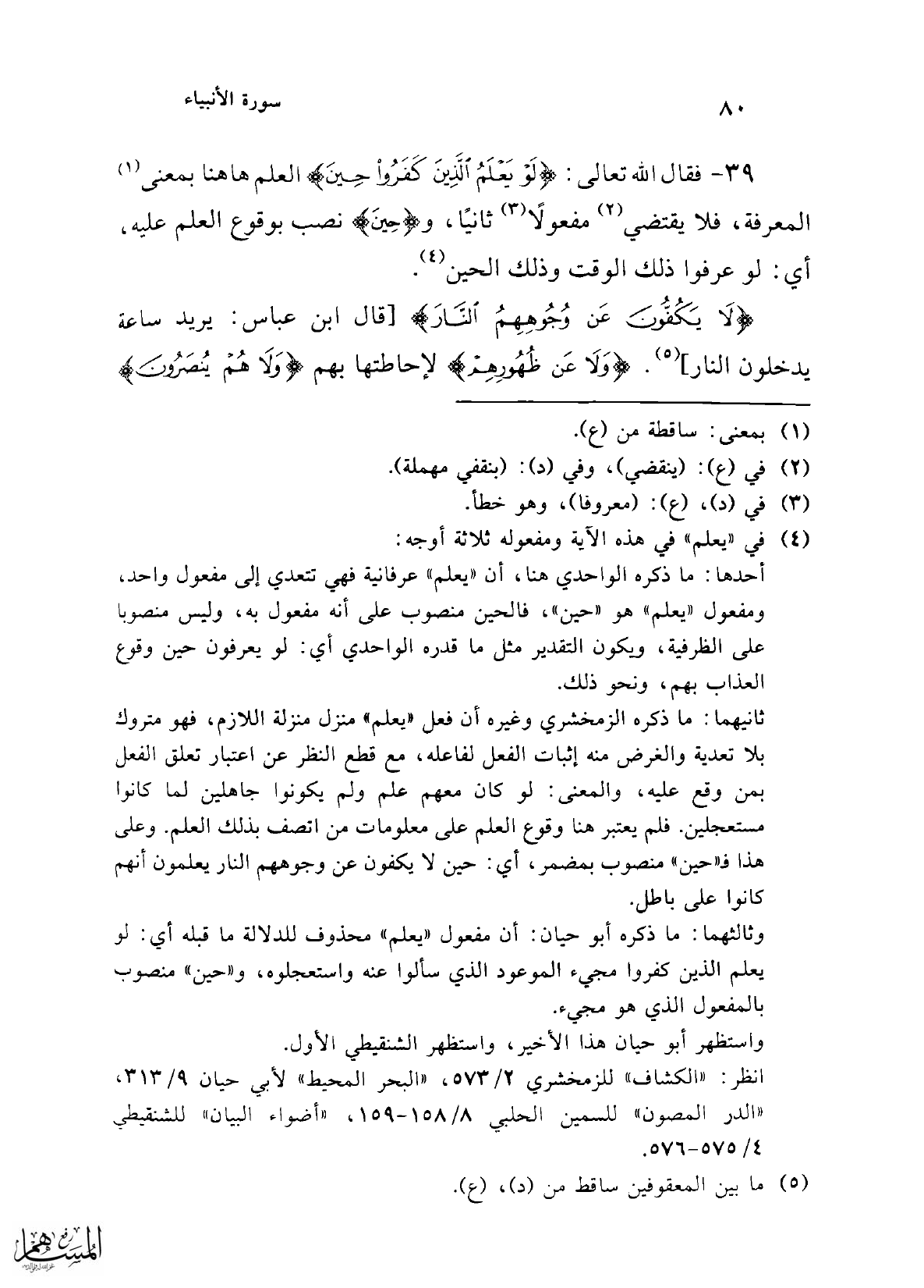 39 - فقال الله تعالى: {لَوْ يَعْلَمُ الَّذِينَ كَفَرُوا حِينَ} العلم هاهنا بمعنى (¬1) المعرفة، فلا يقتضي (¬2) مفعولًا (¬3) ثانيًا، و {حِينَ} نصب بوقوع العلم عليه، أي: لو عرفوا ذلك الوقت وذلك الحين (¬4).