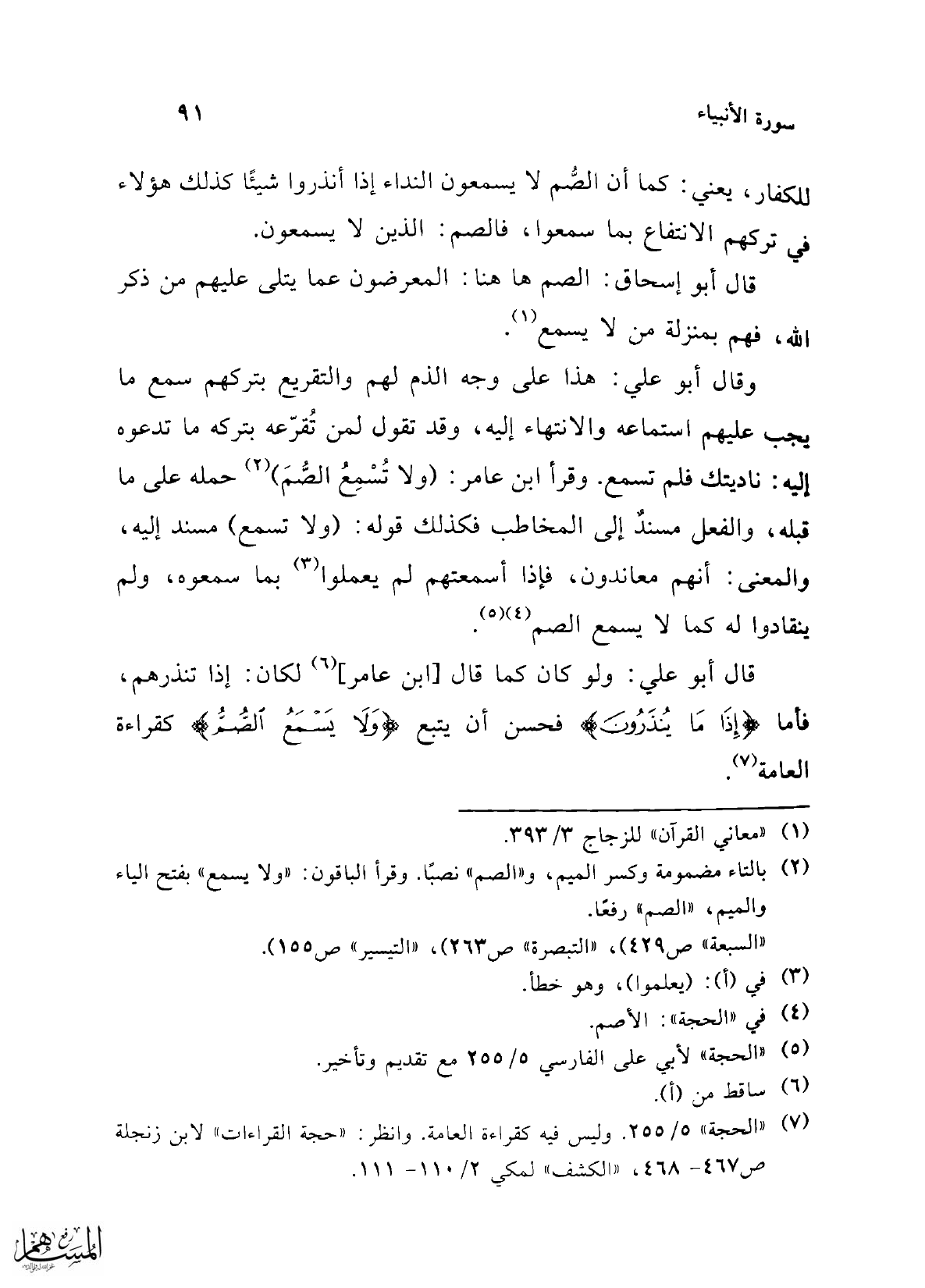 (¬5) "الحجة" لأبي على الفارسي 5/ 255 مع تقديم وتأخير.