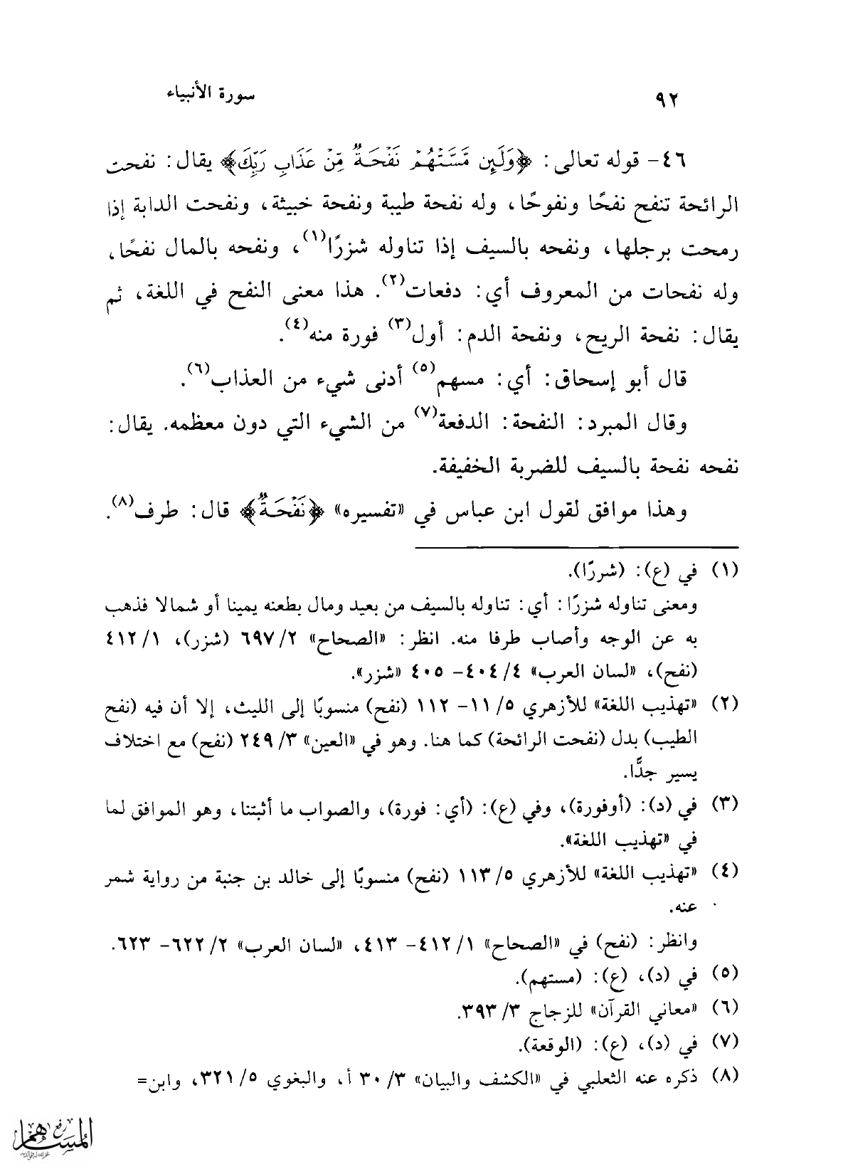 46 - قوله تعالى: {وَلَئِنْ مَسَّتْهُمْ نَفْحَةٌ مِنْ عَذَابِ رَبِّكَ} يقال: نفحت الرائحة تنفح نفحًا ونفوحًا, وله نفحة طيبة ونفحة خبيثة، ونفحت الدابة إذا رمحت برجلها، ونفحه بالسيف إذا تناوله شزرًا (¬1)، ونفحه بالمال نفحًا، وله نفحات من المعروف أي: دفعات (¬2). هذا معنى النفح في اللغة، ثم يقال: نفحة الريح، ونفحة الدم: أول (¬3) فورة منه (¬4).