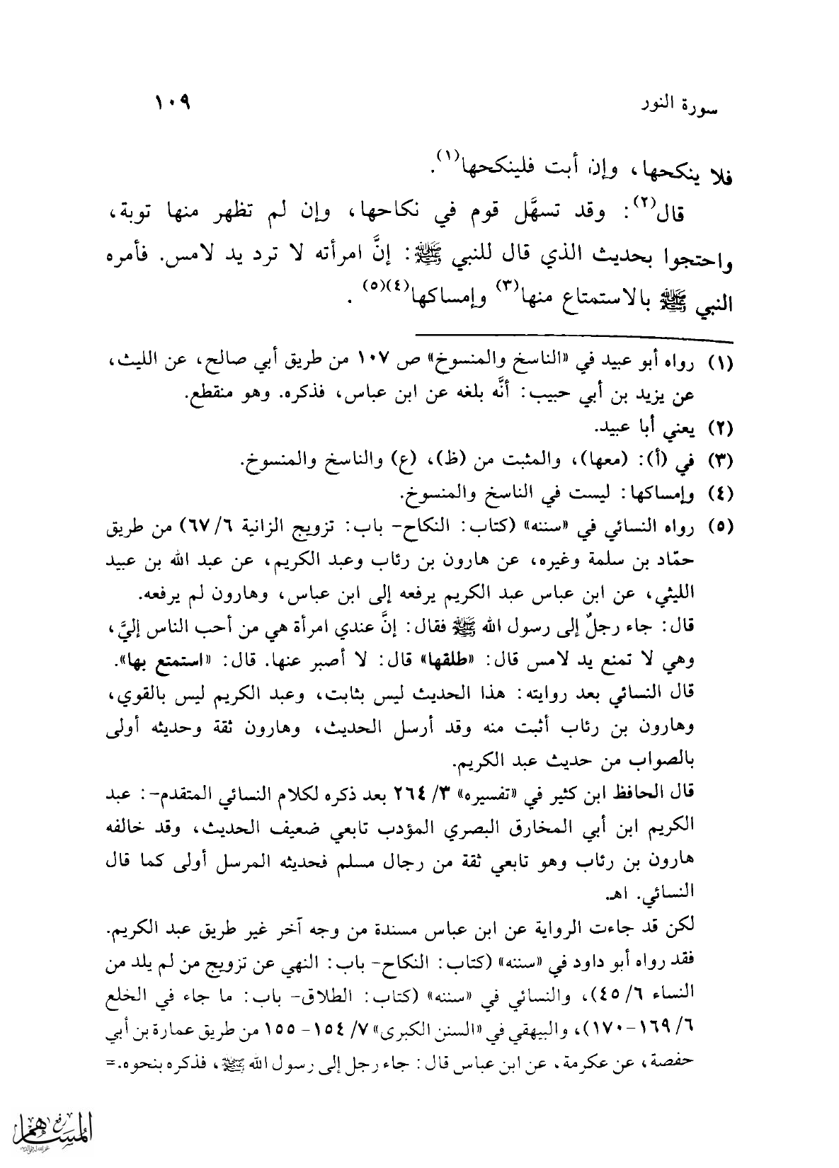 (¬5) رواه النسائي في "سننه" (كتاب: النكاح- باب: تزويج الزانية 6/ 67) من طريق حمّاد بن سلمة وغيره، عن هارون بن رئاب وعبد الكريم، عن عبد الله بن عبيد الليثي، عن ابن عباس عبد الكريم يرفعه إلى ابن عباس، وهارون لم يرفعه.
