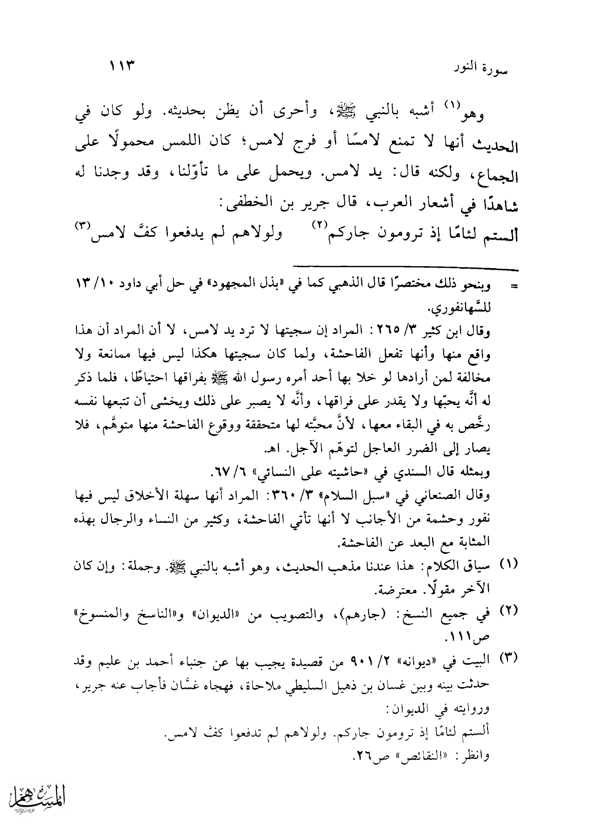 وهو (¬1) أشبه بالنبي -صلى الله عليه وسلم-، وأحرى أن يظن بحديثه. ولو كان في الحديث أنها لا تمنع لامسًا أو فرج لامس؛ كان اللمس محمولًا على الجماع، ولكنه قال: يد لامس. ويحمل على ما تأوّلنا، وقد وجدنا له شاهدًا في أشعار العرب، قال جرير بن الخطفى: