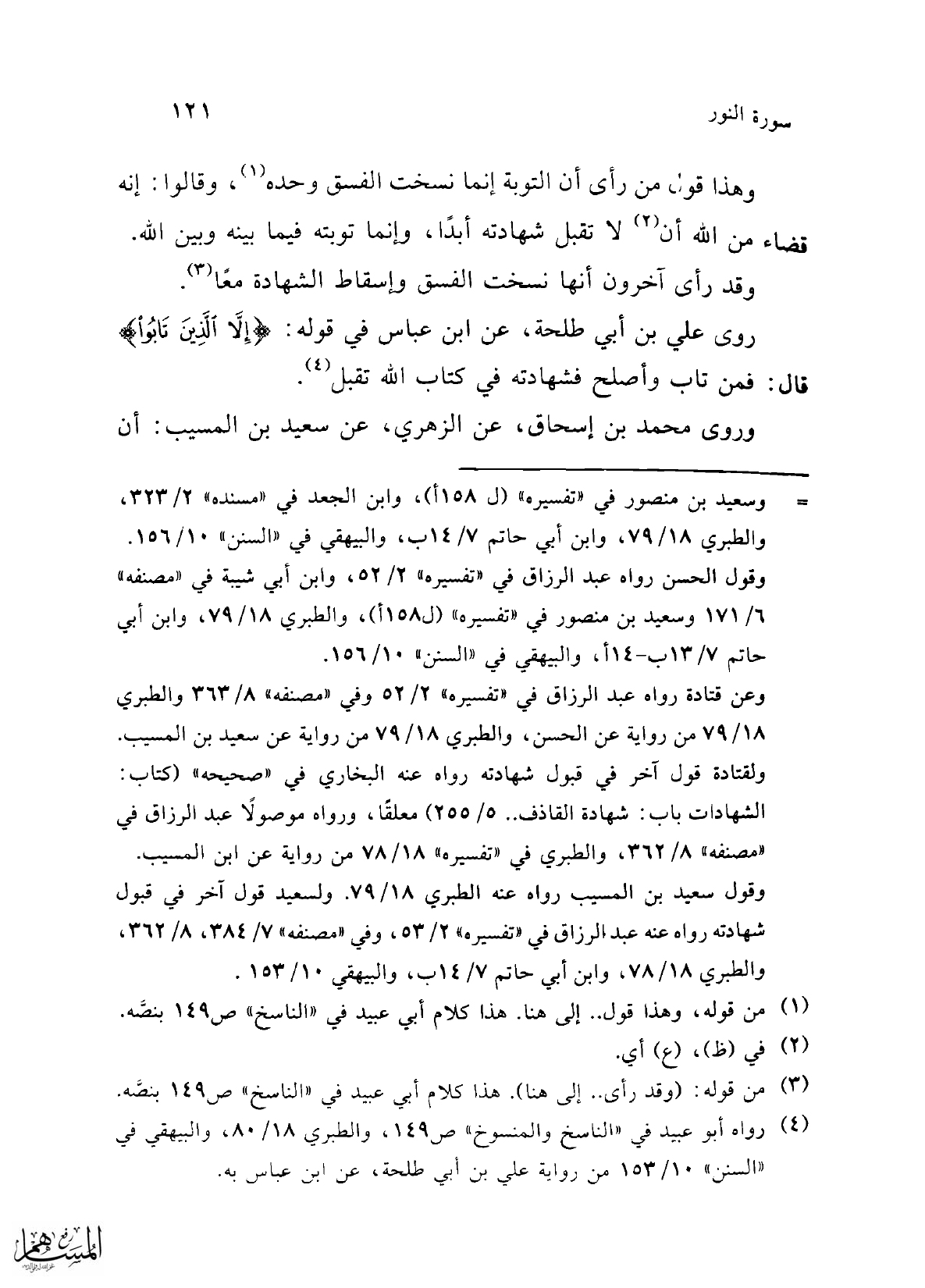 (¬4) رواه أبو عبيد في "الناسخ والمنسوخ" ص 149، والطبري 18/ 80، والبيهقي في "السنن" 10/ 153 من رواية علي بن أبي طلحة، عن ابن عباس به.