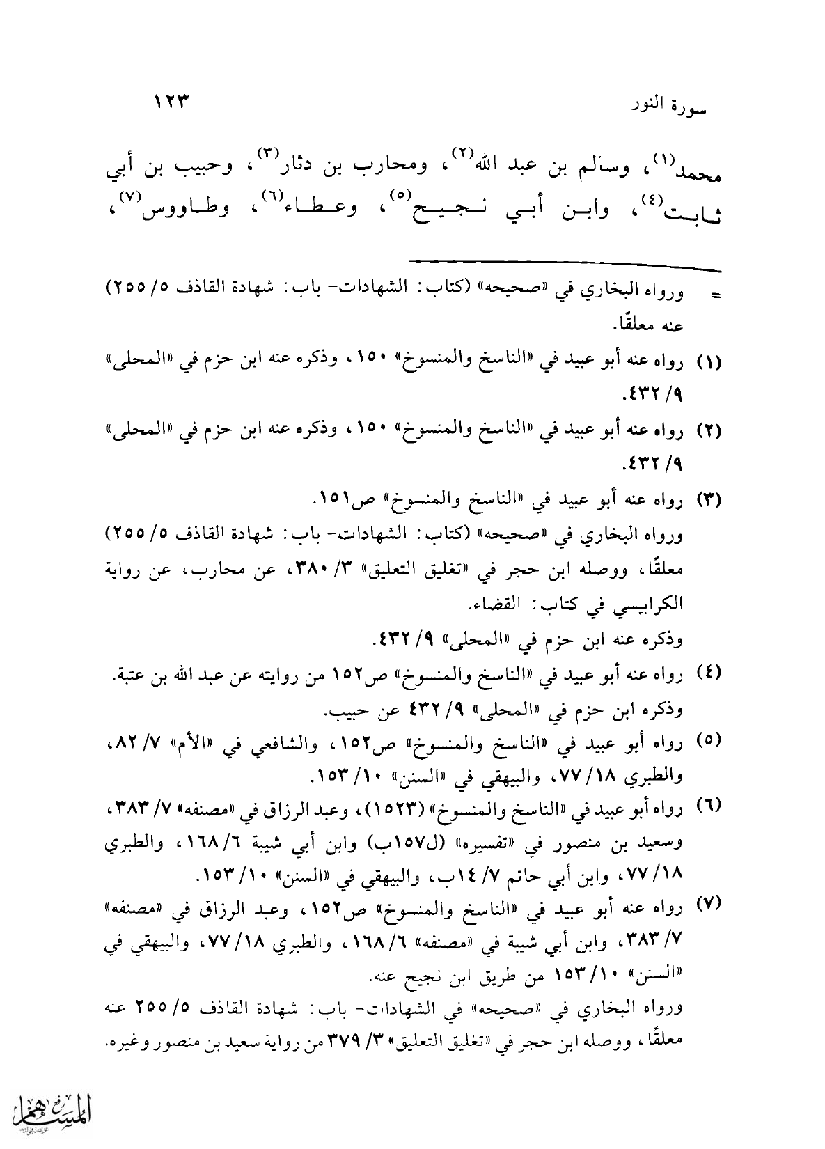 (¬7) رواه عنه أبو عبيد في "الناسخ والمنسوخ" ص 152، وعبد الرزاق في "مصنفه" 7/ 383، وابن أبي شيبة في "مصنفه" 6/ 168، والطبري 18/ 77، والبيهقي في "السنن" 10/ 153 من طريق ابن نجيح عنه.