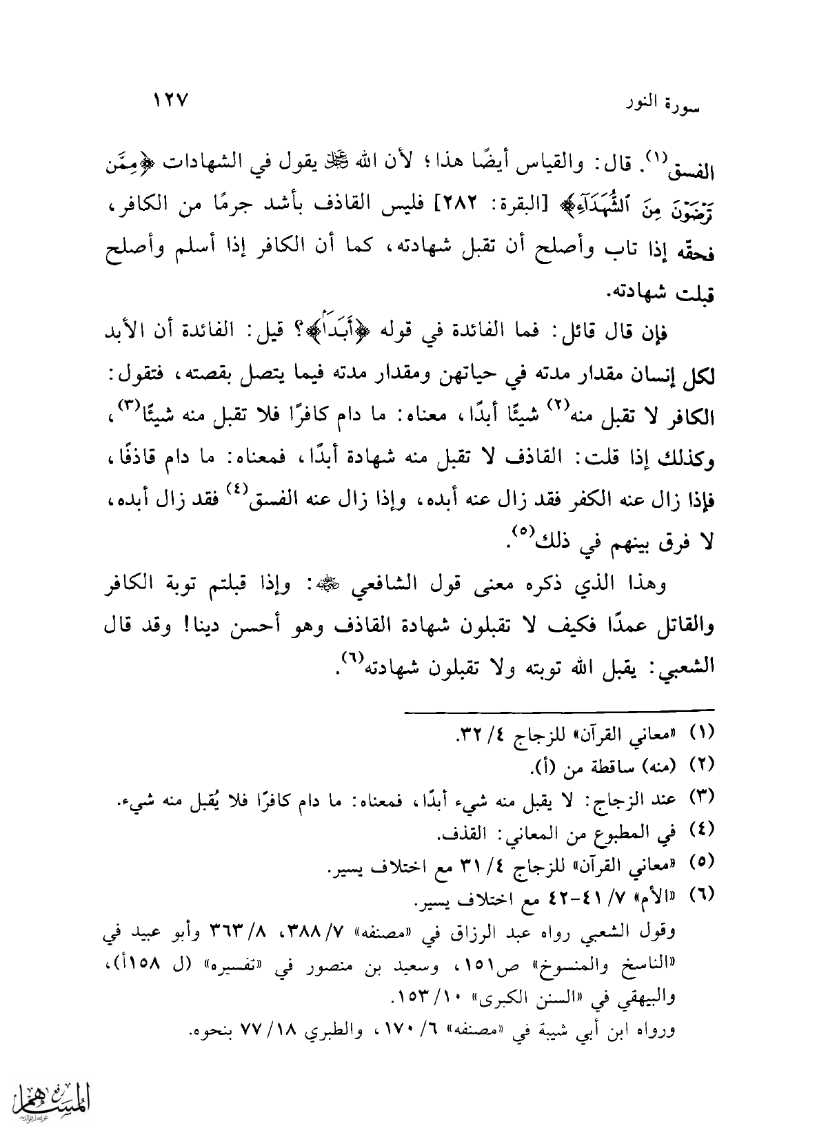 وهذا الذي ذكره معنى قول الشافعي -رضي الله عنه-: وإذا قبلتم توبة الكافر والقاتل عمدًا فكيف لا تقبلون شهادة القاذف وهو أحسن دينا! وقد قال الشعبي: يقبل الله توبته ولا تقبلون شهادته (¬6).
