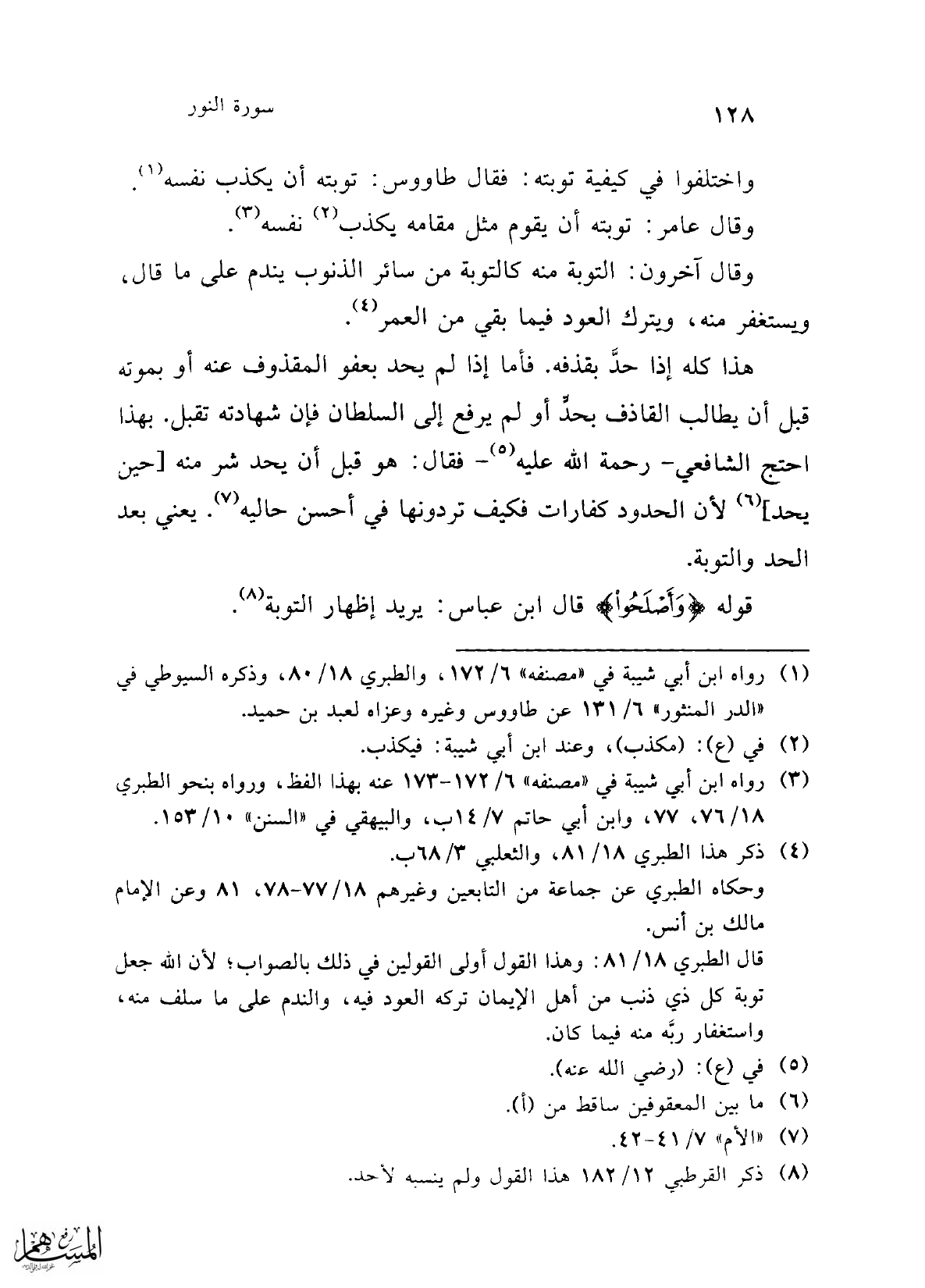 وقال آخرون: التوبة منه كالتوبة من سائر الذنوب يندم على ما قال، ويستغفر منه، ويترك العود فيما بقي من العمر (¬4).
