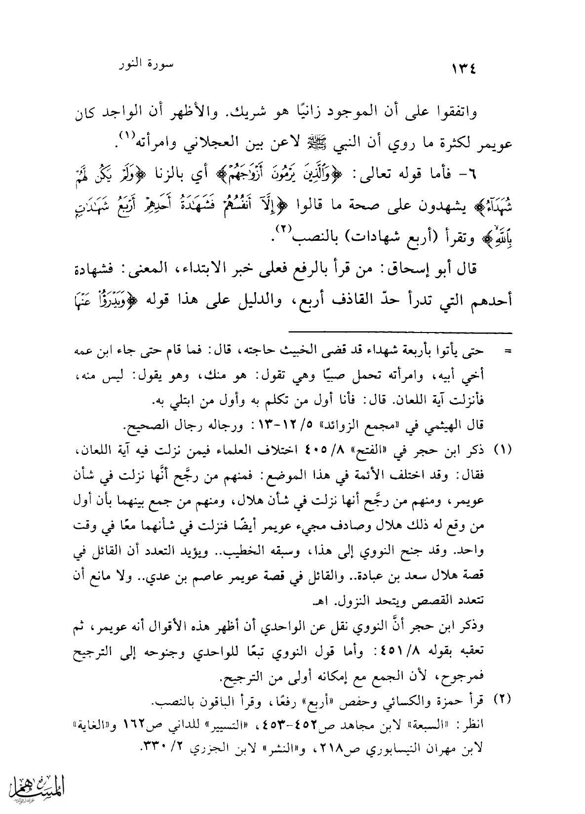 6 - فأما قوله تعالى: {وَالَّذِينَ يَرْمُونَ أَزْوَاجَهُمْ} أي بالزنا {وَلَمْ يَكُنْ لَهُمْ شُهَدَاءُ} يشهدون على صحة ما قالوا {إِلَّا أَنْفُسُهُمْ فَشَهَادَةُ أَحَدِهِمْ أَرْبَعُ شَهَادَاتٍ بِاللَّهِ} وتقرأ (أربع شهادات) بالنصب (¬2).