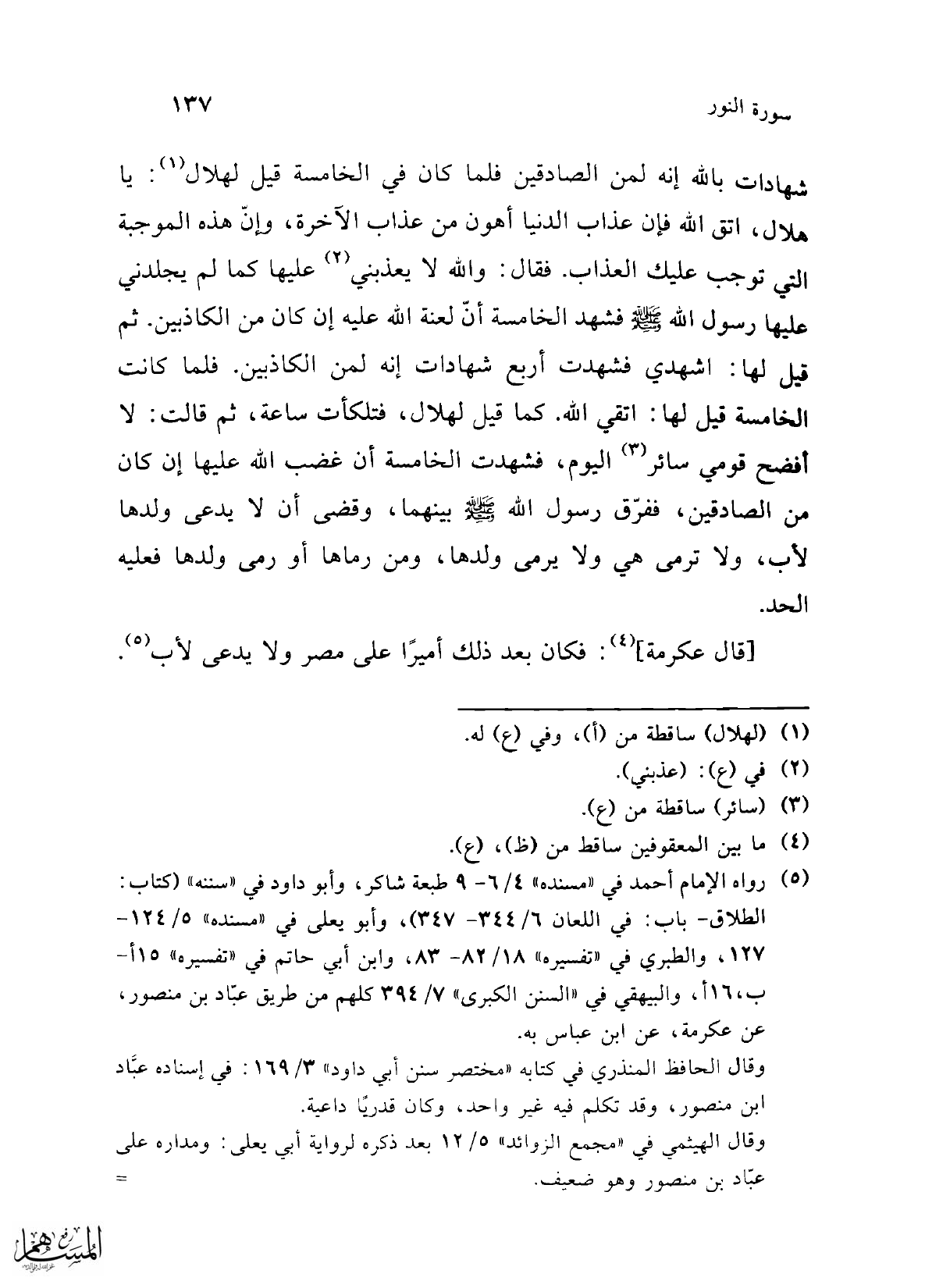 (¬5) رواه الإمام أحمد في "مسنده" 4/ 6 - 9 طبعة شاكر، وأبو داود في "سننه" (كتاب: الطلاق - باب: في اللعان 6/ 344 - 347)، وأبو يعلى في "مسنده" 5/ 124 - 127، والطبري في "تفسيره" 18/ 82 - 83، وابن أبي حاتم في "تفسيره" 15 أ - ب، 16 أ، والبيهقي في "السنن الكبرى" 7/ 394 كلهم من طريق عبّاد بن منصور، عن عكرمة، عن ابن عباس به.