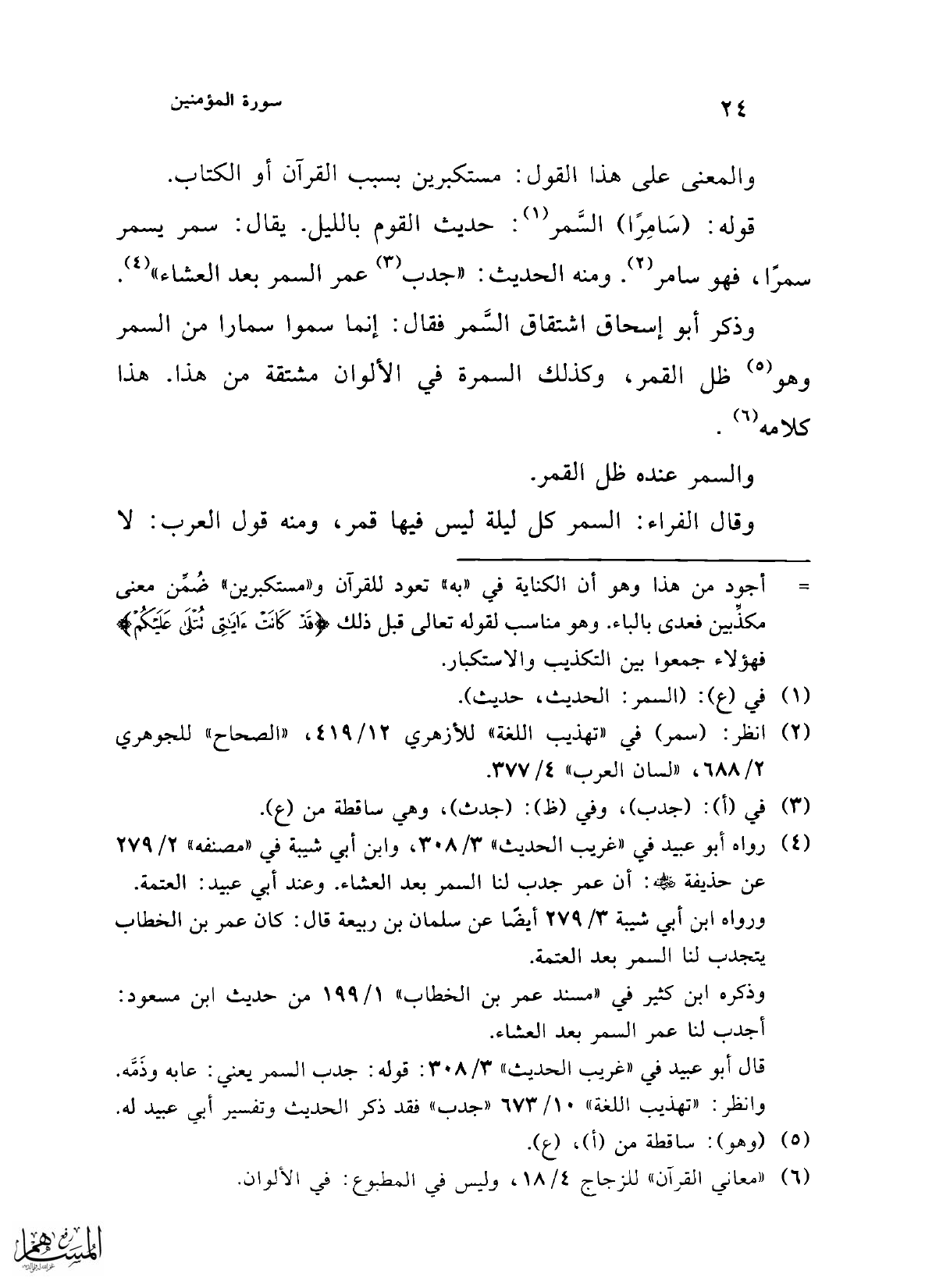 قوله: {سَامِرًا} السَّمر (¬1): حديث القوم بالليل. يقال: سمر يسمر سمرًا، فهو سأمر (¬2). ومنه الحديث: "جدب (¬3) عمر السمر بعد العشاء" (¬4).