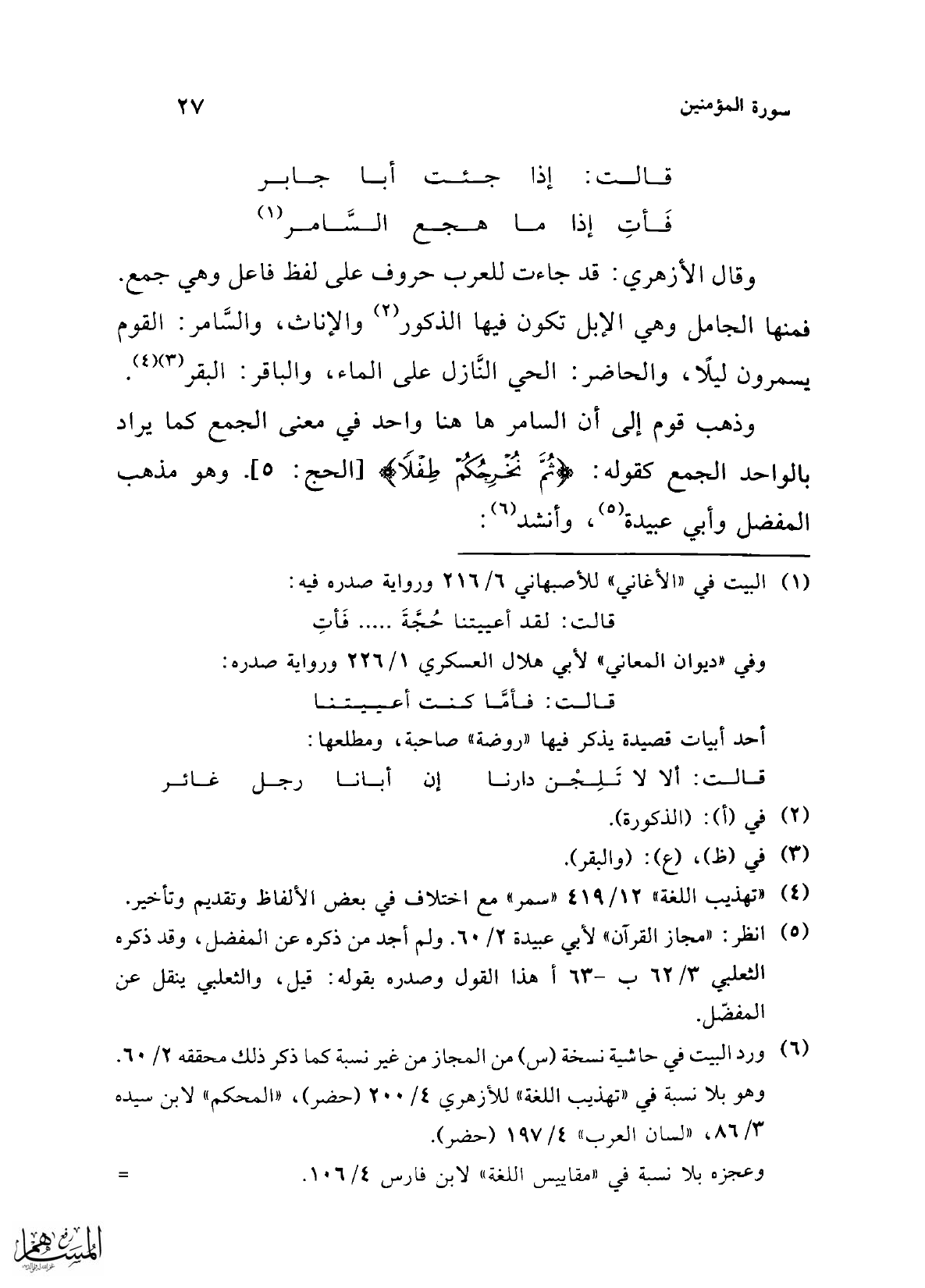 وذهب قوم إلى أن السامر هاهنا واحد في معنى الجمع كما يراد بالواحد الجمع كقوله: {ثُمَّ نُخْرِجُكُمْ طِفْلًا} [الحج: 5]. وهو مذهب المفضل وأبي عبيدة (¬5)، وأنشد (¬6):