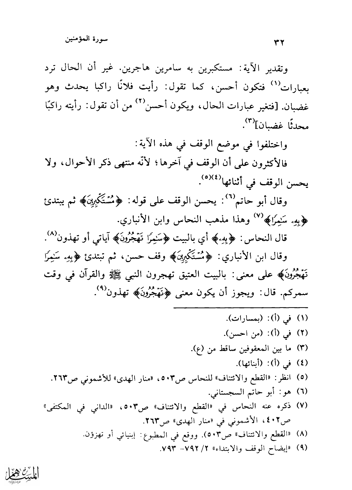وقال أبو حاتم (¬6): يحسن الوقف على قوله: {مُسْتَكْبِرِينَ} ثم يبتدئ {بِهِ سَامِرًا} (¬7) وهذا مذهب النحاس وابن الأنباري.