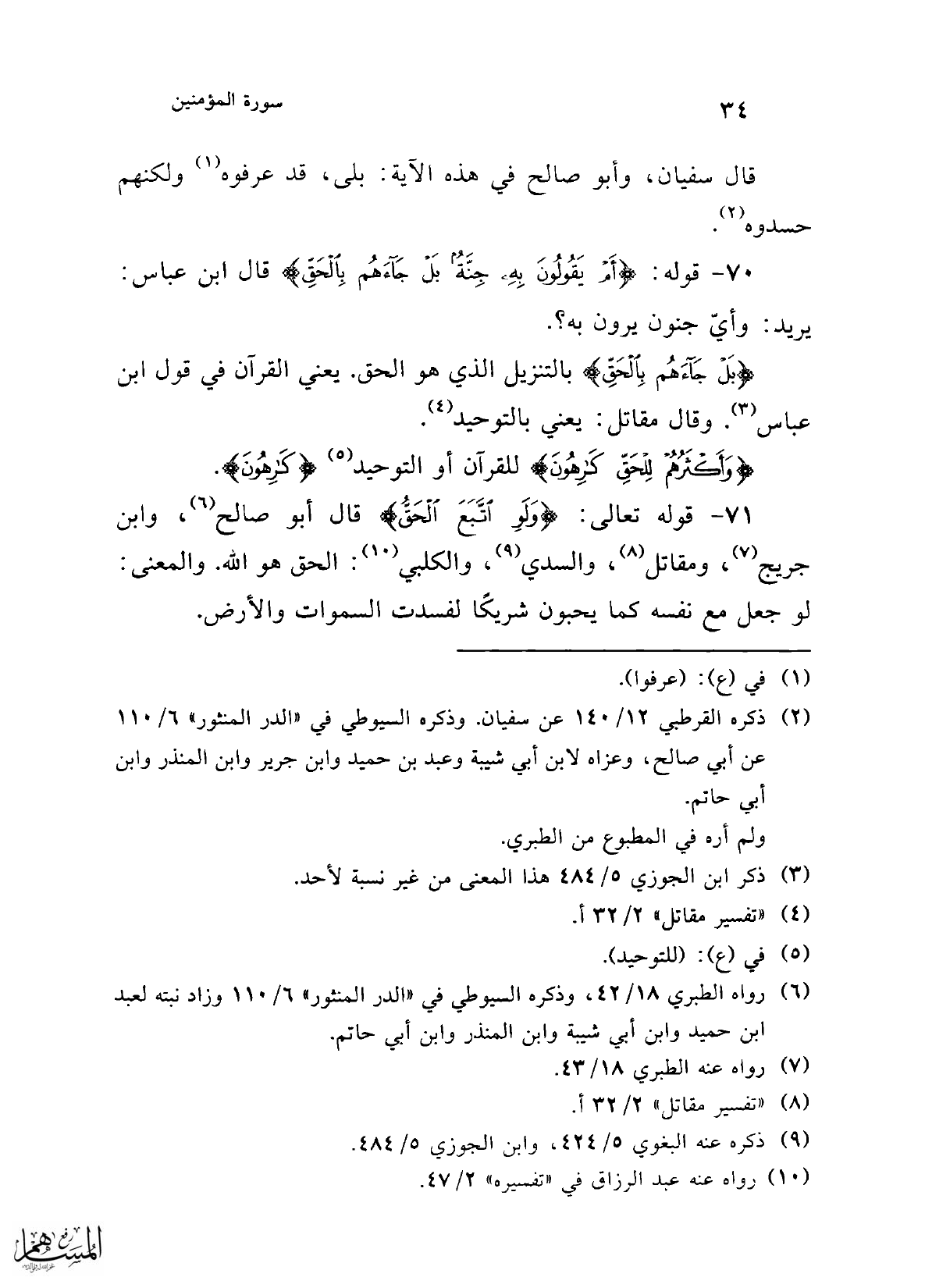 70 - قوله: {أَمْ يَقُولُونَ بِهِ جِنَّةٌ بَلْ جَاءَهُمْ بِالْحَقِّ} قال ابن عباس: يريد: وأيّ جنون يرون به؟.