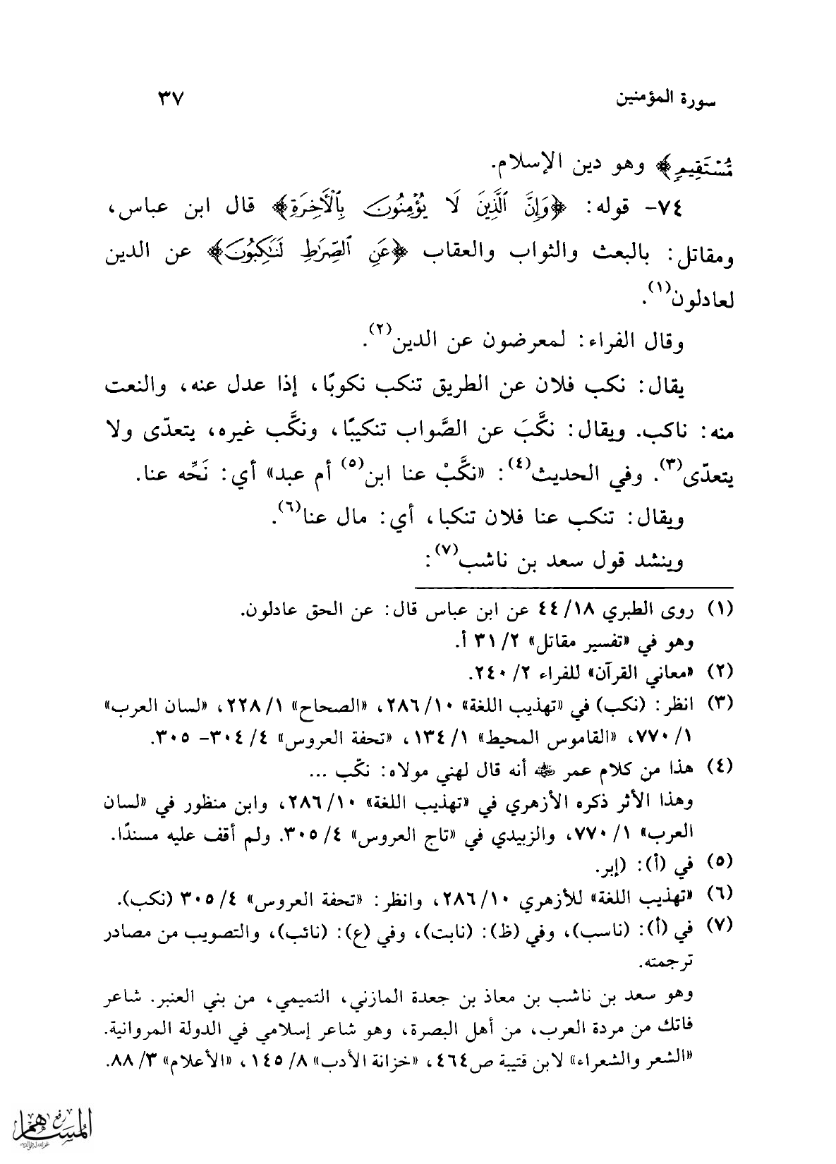 74 - قوله: {وَإِنَّ الَّذِينَ لَا يُؤْمِنُونَ بِالْآخِرَةِ} قال ابن عباس، ومقاتل: بالبعث والثواب والعقاب {عَنِ الصِّرَاطِ لَنَاكِبُونَ} عن الدين لعادلون (¬1).
