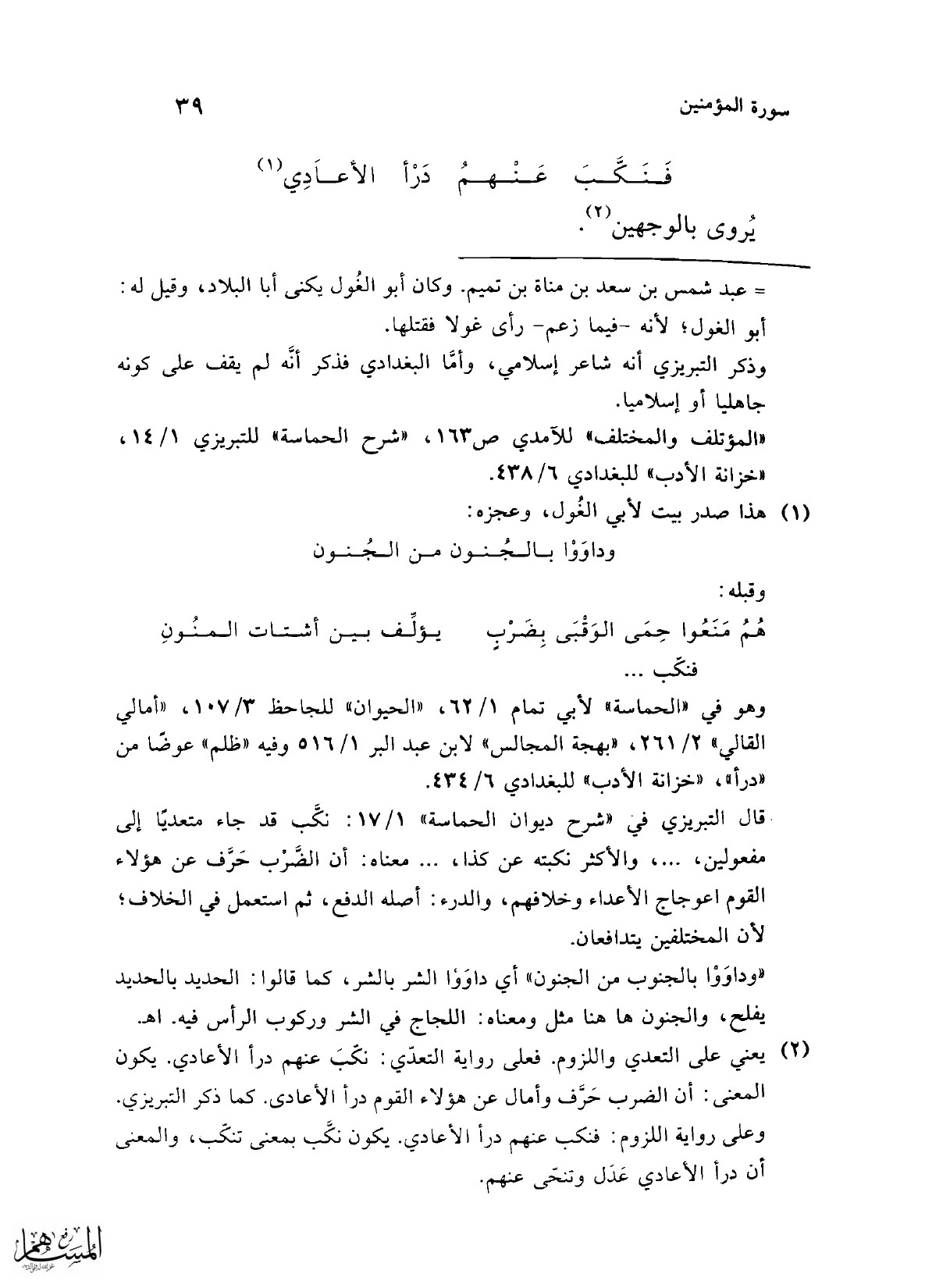 (¬2) يعني على التعدي واللزوم. فعلى رواية التعدّي: نكّبَ عنهم درأ الأعادي. يكون المعى: أن الضرب حَرَّف وأمال عن هؤلاء القوم درأ الأعادى. كما ذكر التبريزي. وعلى رواية اللزوم: فنكب عنهم درأ الأعادي. يكون نكَّب بمعنى تنكّب، والمعنى أن درأ الأعادي عَدَل وتنحّى عنهم.