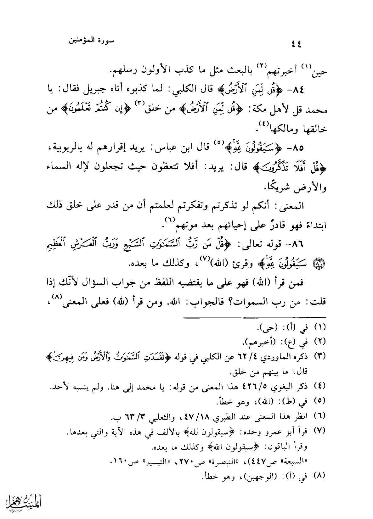 86 - قوله تعالى: {قُلْ مَنْ رَبُّ السَّمَاوَاتِ السَّبْعِ وَرَبُّ الْعَرْشِ الْعَظِيمِ (86) سَيَقُولُونَ لِلَّهِ} وقرئ (الله) (¬7)، وكذلك ما بعده.