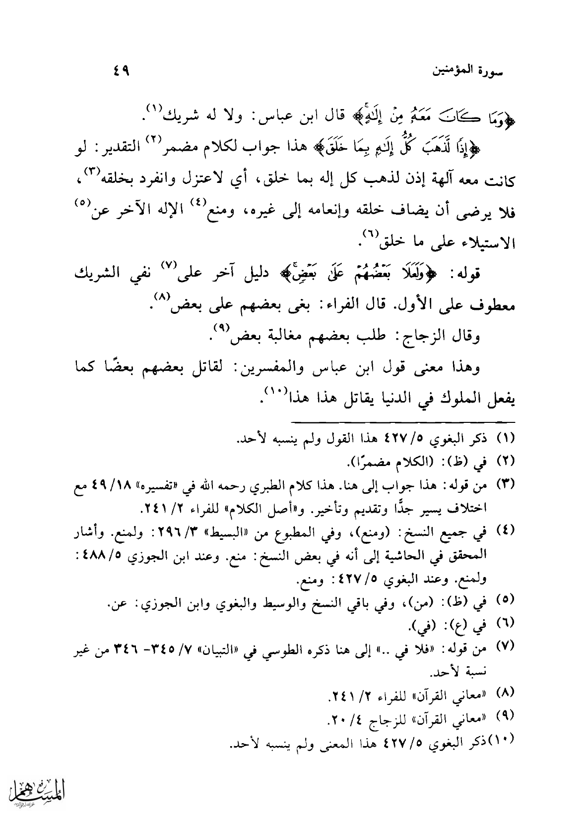 قوله: {وَلَعَلَا بَعْضُهُمْ عَلَى بَعْضٍ} دليل آخر على (¬7) نفي الشريك معطوف على الأول. قال الفراء: بغى بعضهم على بعض (¬8).