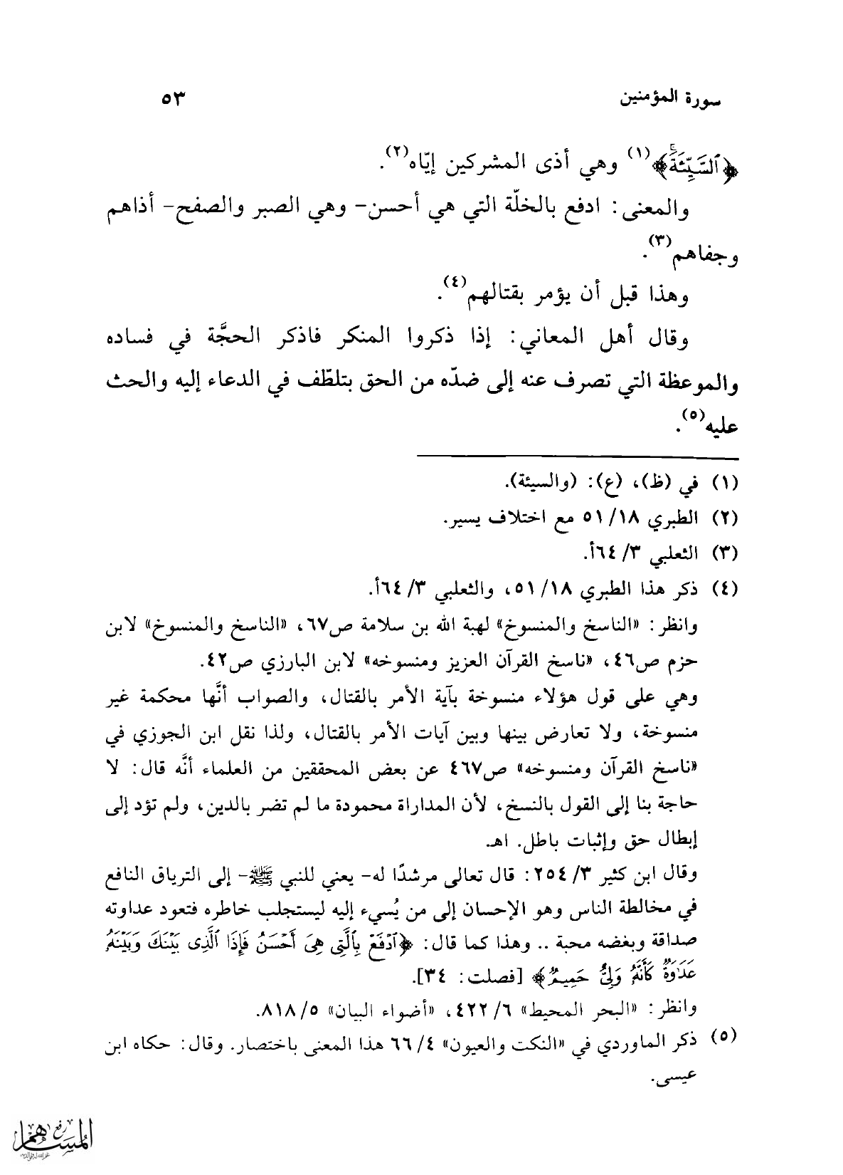وهي على قول هؤلاء منسوخة بآية الأمر بالقتال، والصواب أنَّها محكمة غير منسوخة، ولا تعارض بينها وبين آيات الأمر بالقتال، ولذا نقل ابن الجوزي في "ناسخ القرآن ومنسوخه" ص 467 عن بعض المحققين من العلماء أنَّه قال: لا حاجة بنا إلى القول بالنسخ، لأن المداراة محمودة ما لم تضر بالدين، ولم تؤد إلى إبطال حق وإثبات باطل. اهـ.