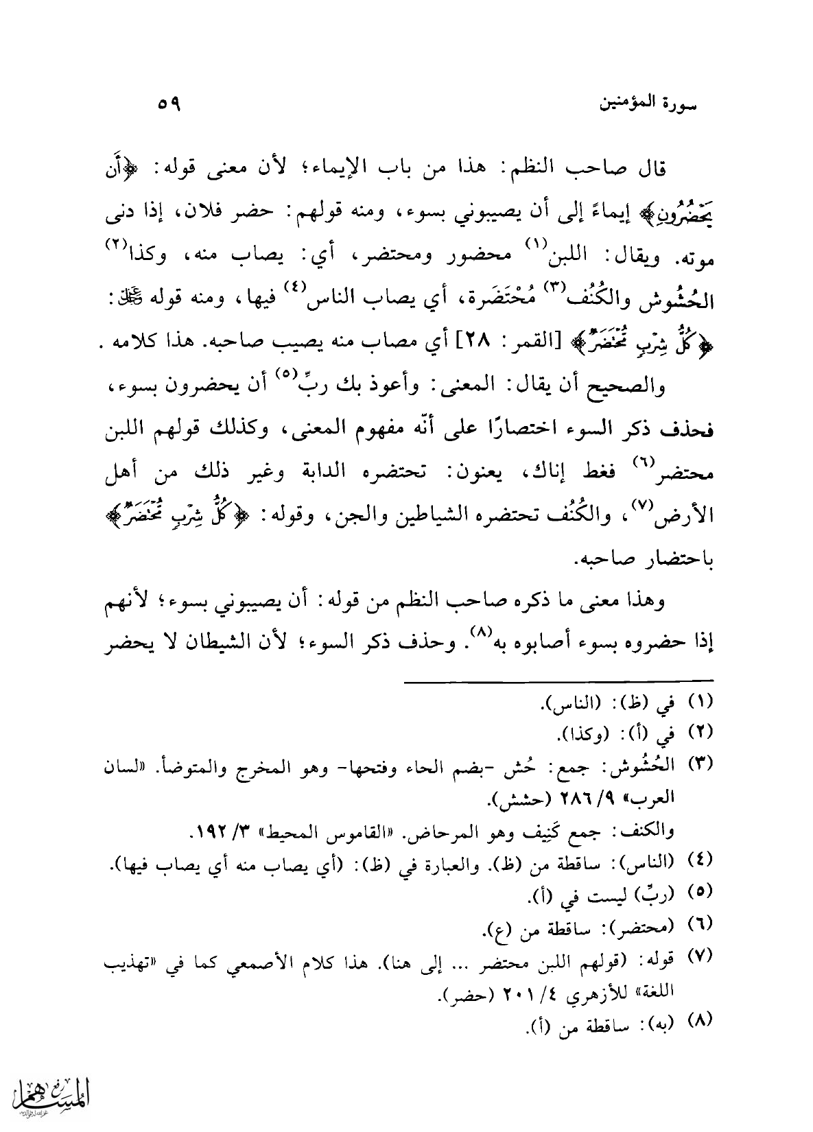 قال صاحب النظم: هذا من باب الإيماء؛ لأن معنى قوله: {أَنْ يَحْضُرُونِ} إيماءً إلى أن يصيبوني بسوء، ومنه قولهم: حضر فلان، إذا دنى موته. ويقال: اللبن (¬1) محضور ومحتضر، أي: يصاب منه، وكذا (¬2) الحُشُوش والكُنُف (¬3) مُحْتَضَرة، أي يصاب الناس (¬4) فيها، ومنه قوله-عز وجل-: {كُلُّ شِرْبٍ مُحْتَضَرٌ} [القمر: 28] أي مصاب منه يصيب صاحبه. هذا كلامه.