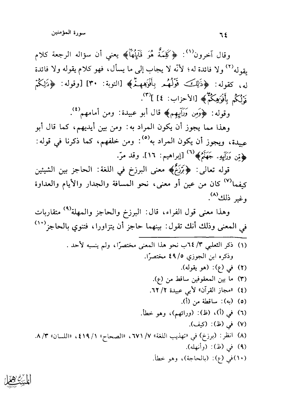 (¬8) انظر: (برزخ) في "تهذيب اللغة" 7/ 671، "الصحاح" 1/ 419، "اللسان" 3/ 8.