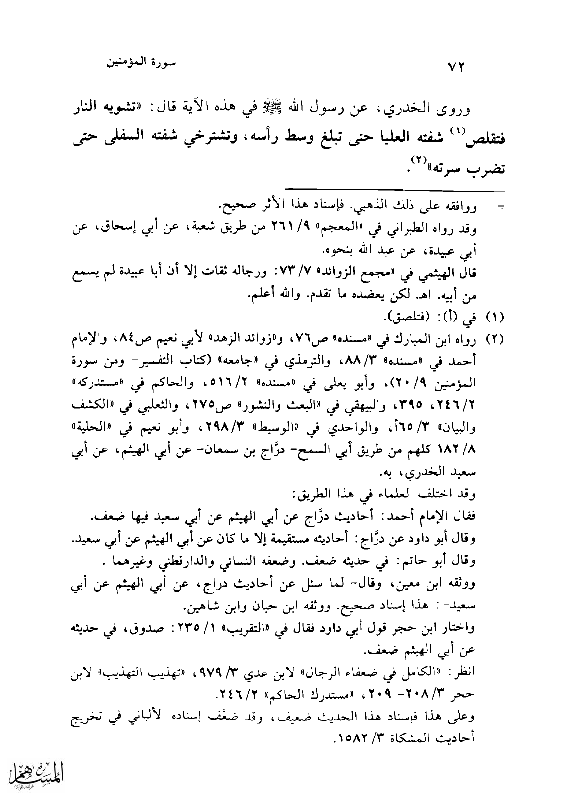 (¬2) رواه ابن المبارك في "مسنده" ص 76، و"زوائد الزهد" لأبي نعيم ص 84، والإمام أحمد في "مسنده" 3/ 88، والترمذي في "جامعه" (كتاب التفسير- ومن سورة المؤمنين 9/ 20)، وأبو يعلى في "مسنده" 2/ 516، والحاكم في "مستدركه" 2/ 246، 395، والبيهقي في "البعث والنشور" ص 275، والثعلبي في "الكشف والبيان" 3/ 65 أ، والواحدي في "الوسيط" 3/ 298، وأبو نعيم في "الحلية" 8/ 182 كلهم من طريق أبي السمح -درَّاج بن سمعان- عن أبي الهيثم، عن أبي سعيد الخدري، به.