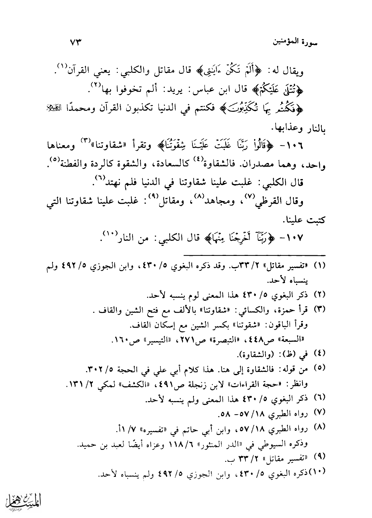 (¬3) قرأ حمزة، والكسائي: "شقاوتنا" بالألف مع فتح الشين والقاف. وقرأ الباقون: "شقوتنا" بكسر الشين مع إسكان القاف. "السبعة" ص 448، "التبصرة" ص 271، "التيسير" ص 160.