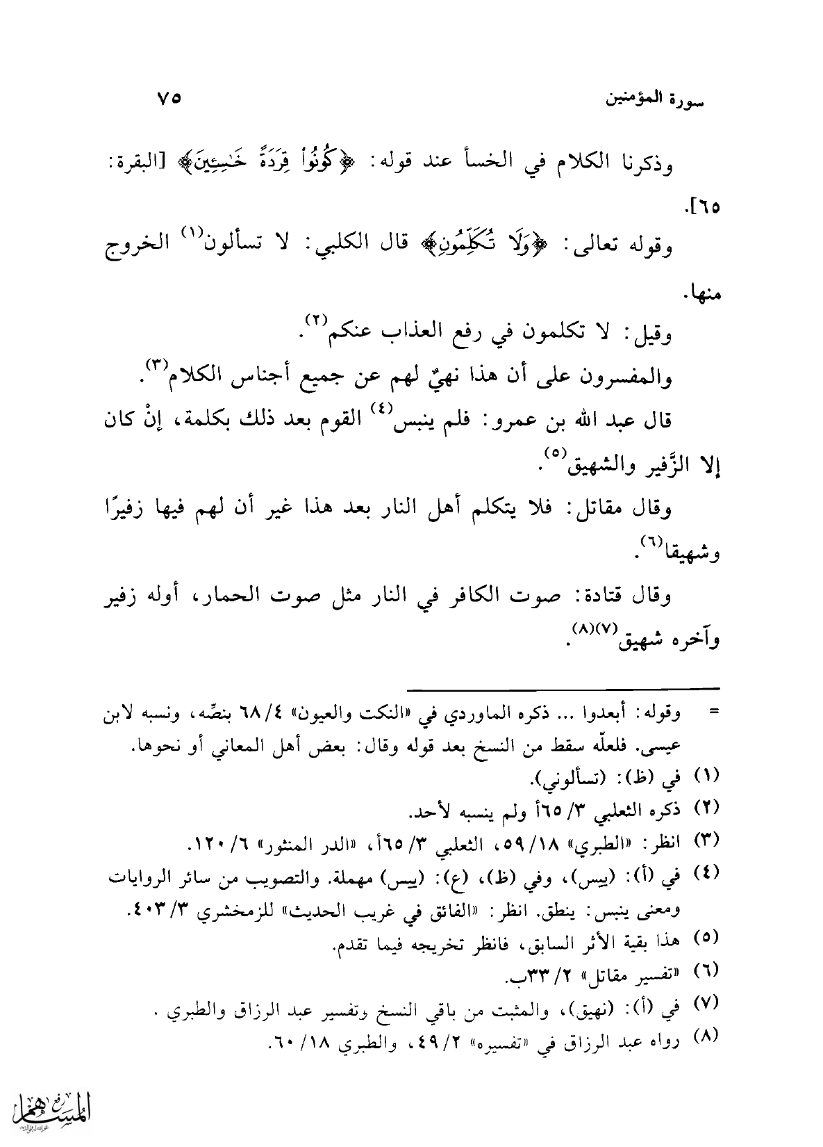 وقوله تعالى: {وَلَا تُكَلِّمُونِ} قال الكلبي: لا تسألون (¬1) الخروج منها.