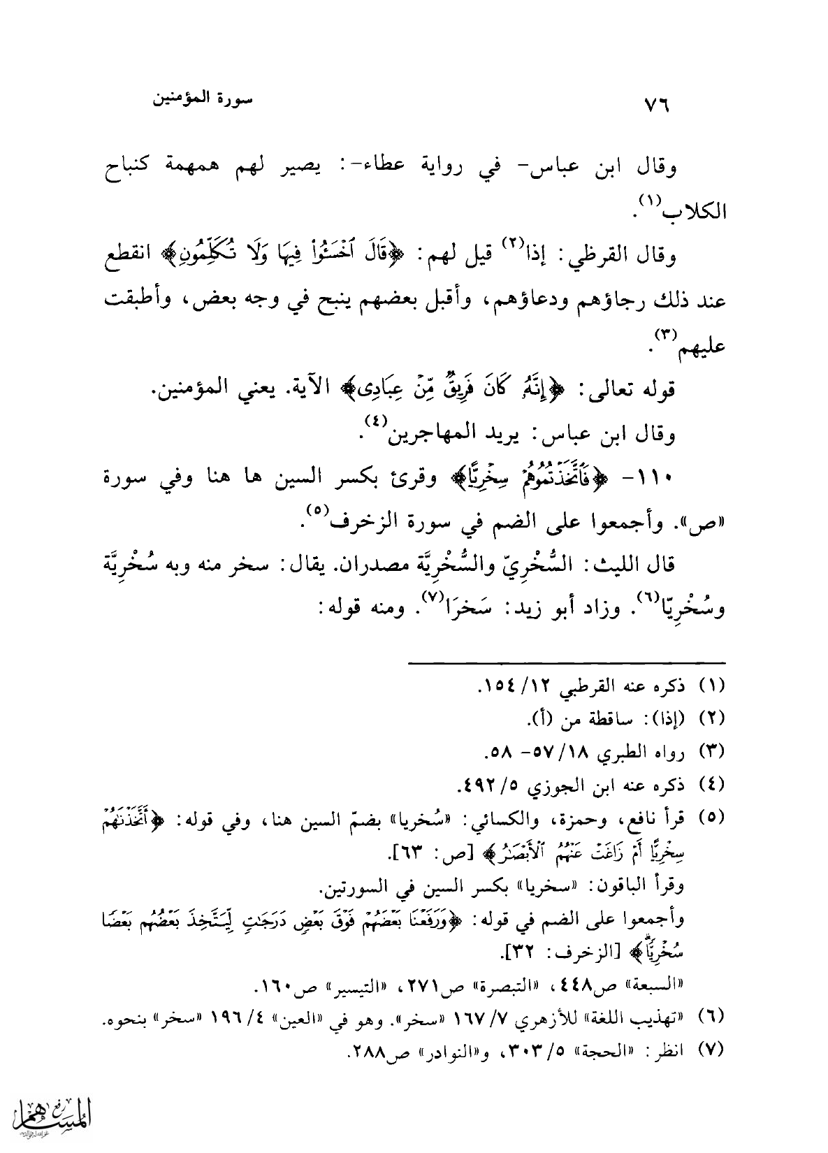 110 - {فَاتَّخَذْتُمُوهُمْ سِخْرِيًّا} وقرئ بكسر السين هاهنا وفي سورة "ص". وأجمعوا على الضم في سورة الزخرف (¬5).
