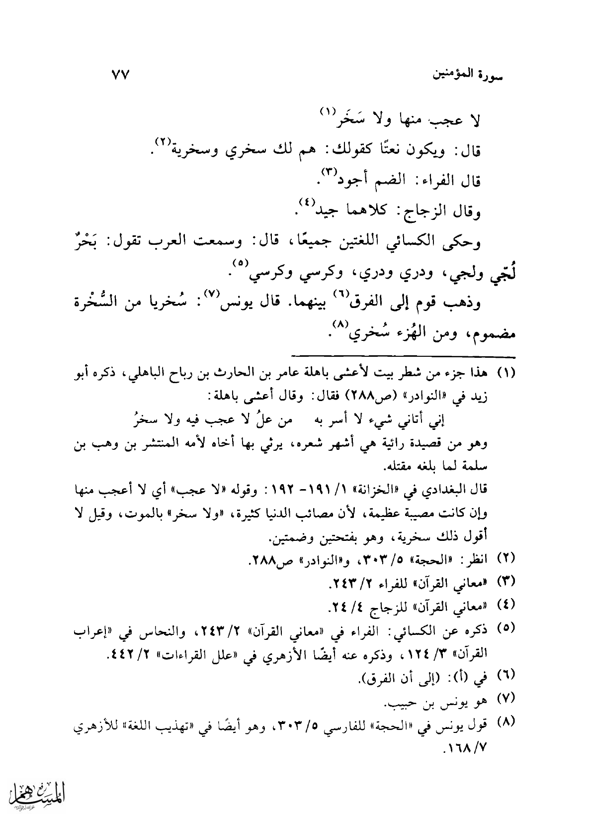 (¬8) قول يونس في "الحجة" للفارسي 5/ 303، وهو أيضًا في "تهذيب اللغة" للأزهري 7/ 168.